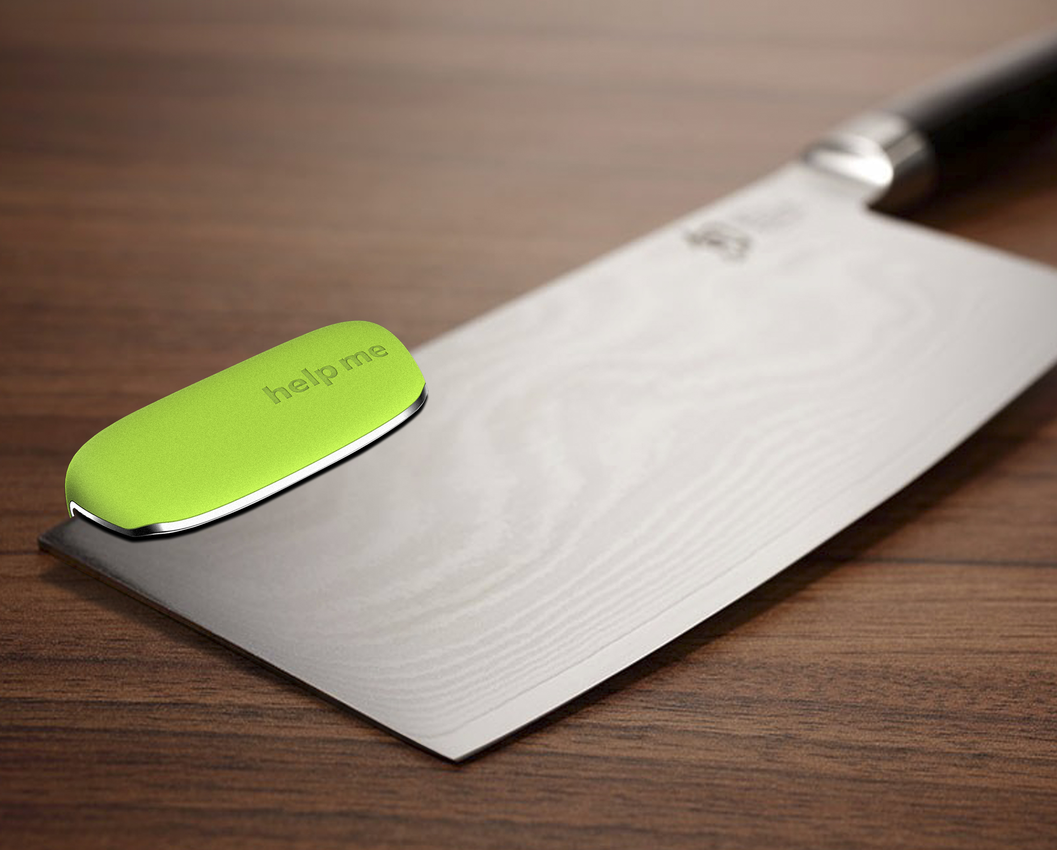 A slim metal chamber couched in a bed of plump silicone, Help Me seeks to remedy that by cushioning the dull, yet cutting backbone of knives for easier food preparation. The metal part within provides strength and distributes weight evenly, but it also serves as a blade polisher that can be used on the sharp edge of knives to keep them clean and keen.
