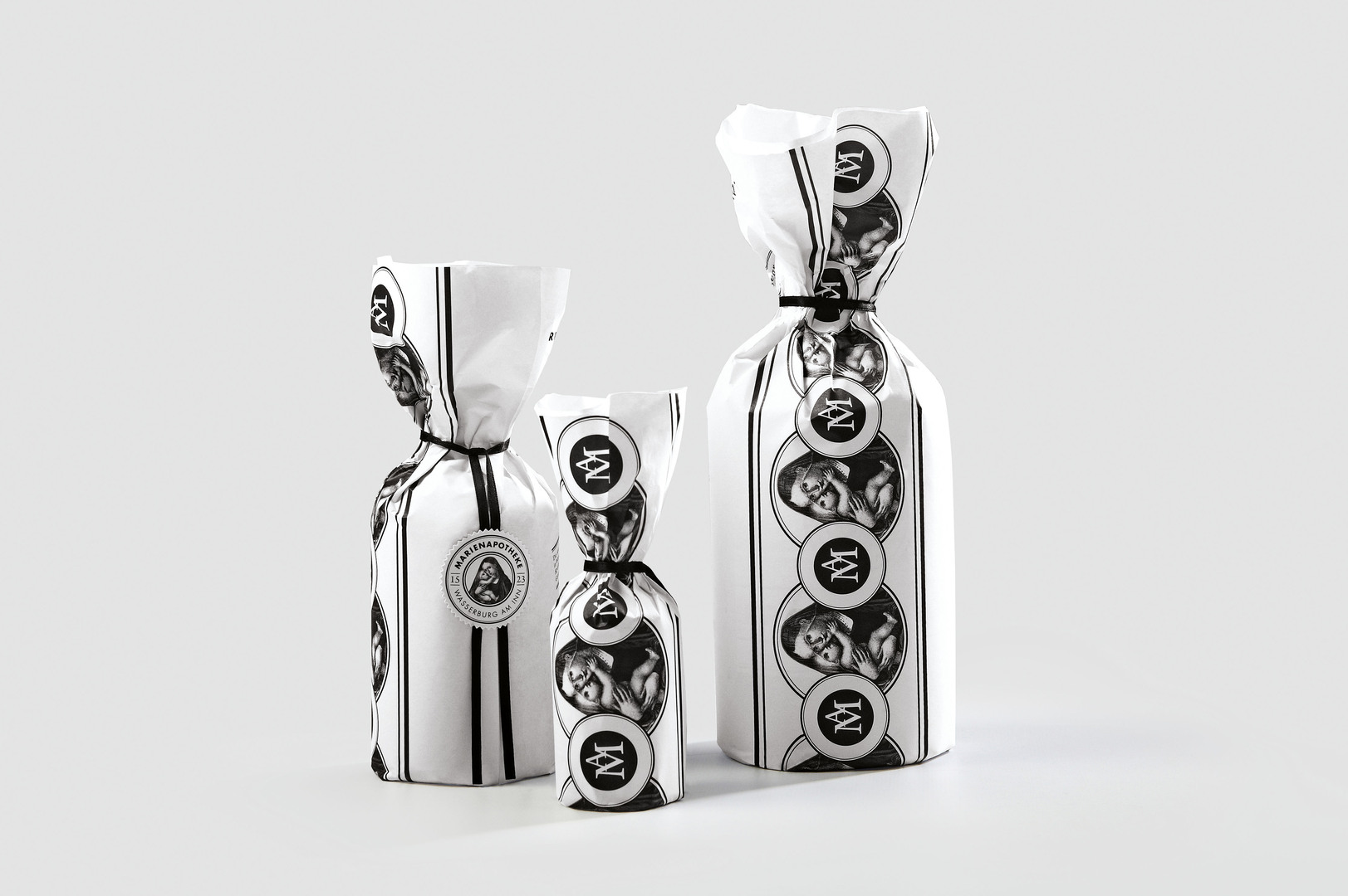 The Marienapotheke pharmacy in the German town of Wasserburg am Inn, which was founded in 1523, has a long-standing tradition of producing an herbal liqueur according to their own recipe. The design concept of the packaging series is based on interplay between historical and modern elements, the combination of high-quality workmanship and straightforward design, as well as the contrast between black and white. The objective was to visualise both the historical and the pharmaceutical connection, while highlighting the premium nature of the product. The labels on the bottles feature the pharmacy’s logo in the form of a modular, relief-embossed seal of quality.