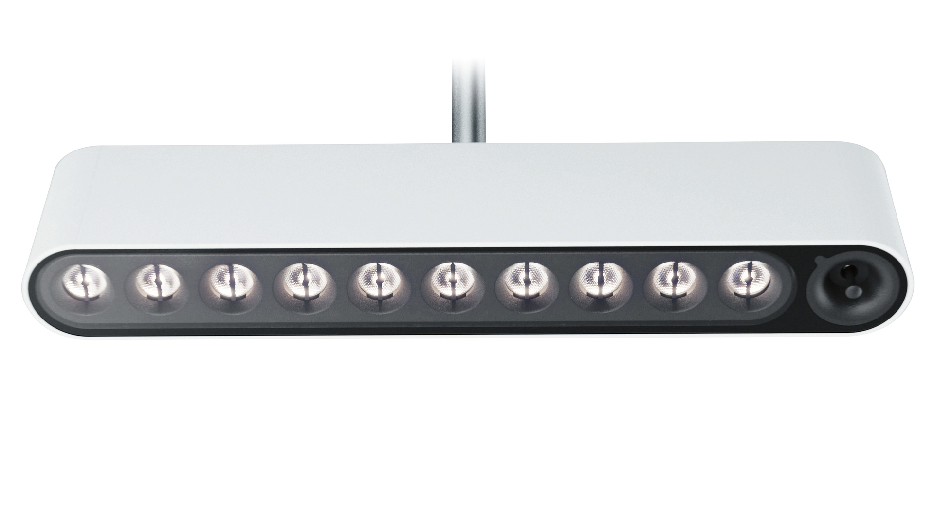This track lighting holds ten spotlights in one luminaire body. The elongated housing features an elegant contour and blends harmoniously into the interior. The angle of reflection and thus the light distribution can be changed via a joystick, while the glare-free light quality is easy on the eyes. Using fewer materials and energy-saving LEDs, the energy required to produce the lighting is approximately equal to the power it consumes in its lifetime, making it a sustainable choice.