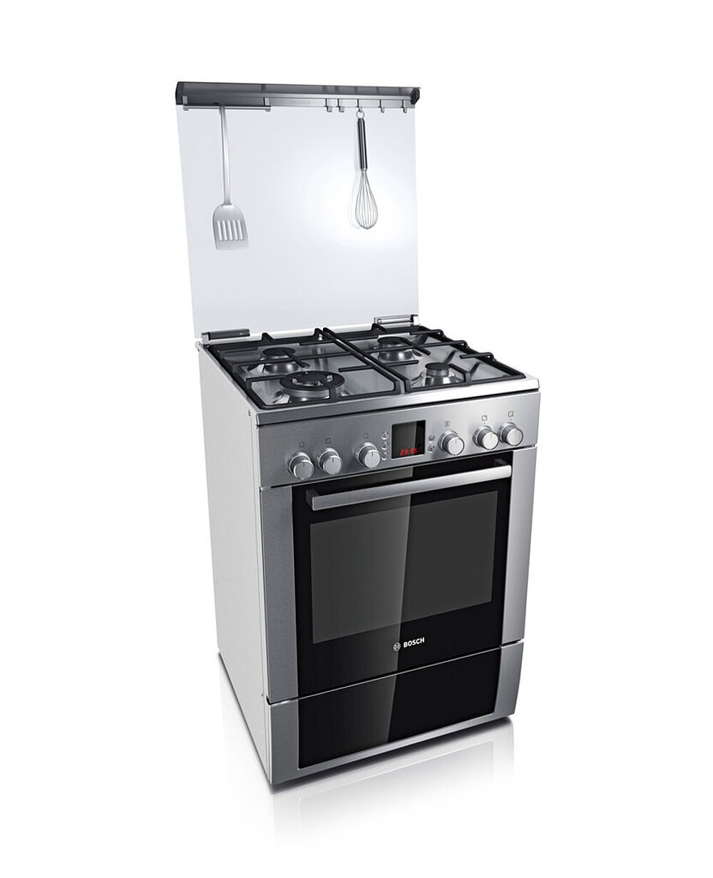 The appearance of this free-standing cooker is characterised by the combination of stainless steel and glass. At the front the extensive use of glass emphasises the exceptionally large oven. The material is also used for the cooking top and as cover or splash protection and makes cleaning easy. Dishwasher-safe iron pan rests and a solid metal handle emphasise the high quality of this appliance.