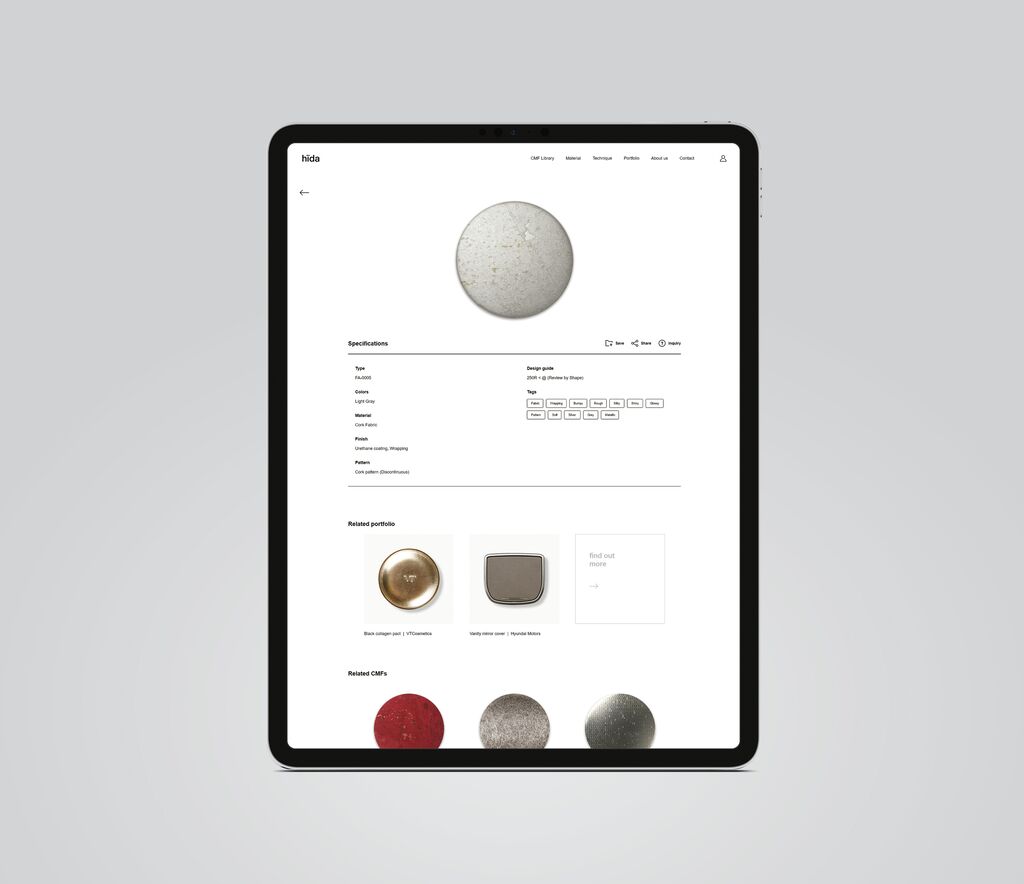 hida is an integrated, highly visual platform that was launched as a CMF (colour, material, finish) resource and design consultation brand site for industrial designers. Its library has an extensive database with more than 300 samples, allowing users to review and compare solutions. Unnecessary elements on the pages are avoided so that users can concentrate on the visuals of the materials, colours and finish textures. Various filters can be applied to view specific samples, and users can select and store personalised CMF solutions to their own library on the platform. Details such as technical specifications are also provided.