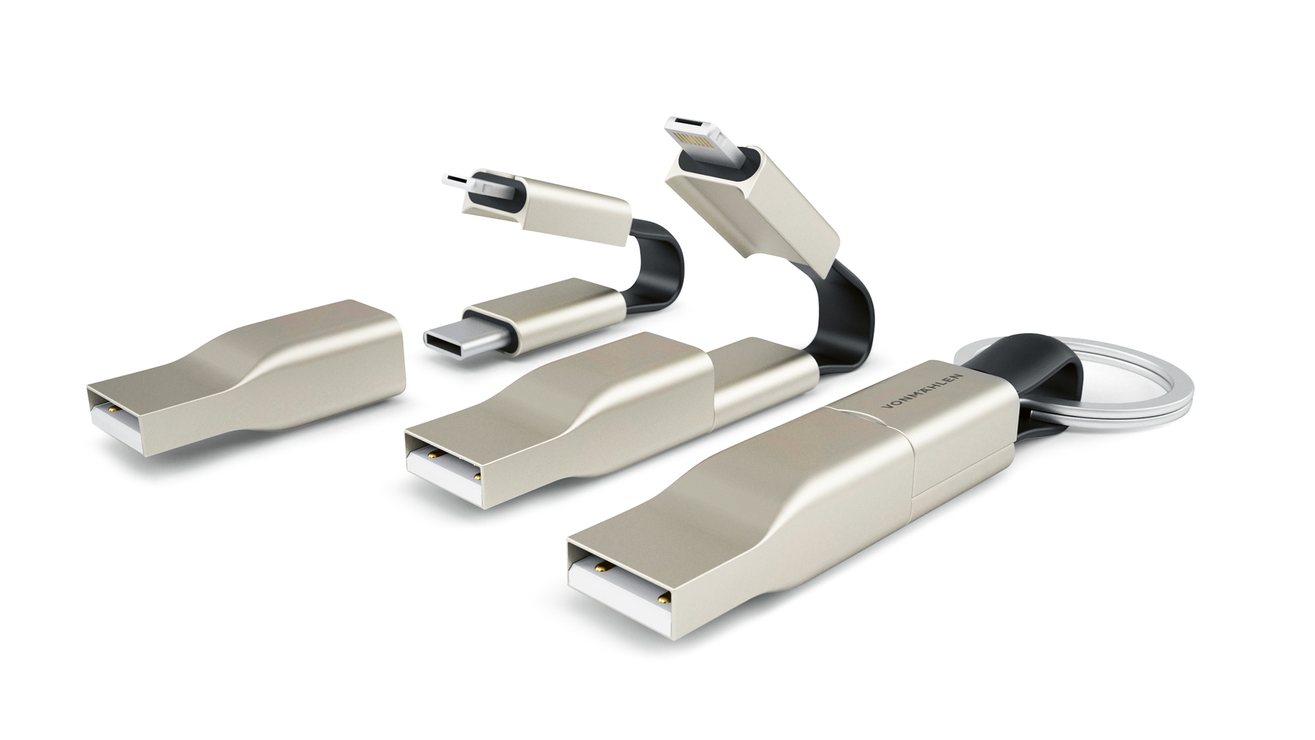 The High Five compact charging cable combines five different connections and thus facilitates the charging of all popular Micro-USB and USB-C devices such as iPhone, iPad and iPod. By plugging the connectors together, the device forms a loop and can be easily attached to a key ring and thus be quickly ready for use. Flowing contours and a high-quality metal housing provide a noble impression.