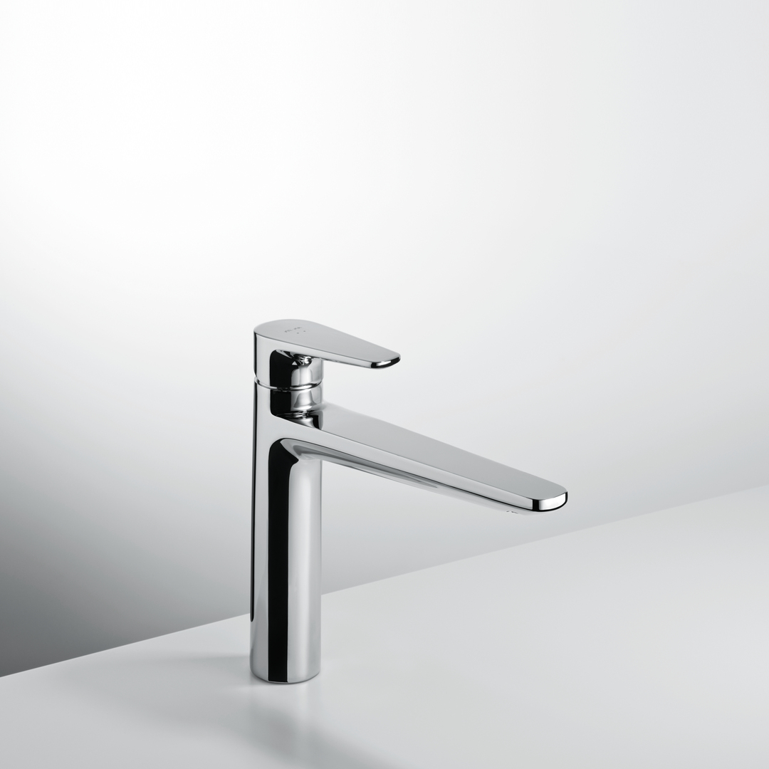 The Inspire single-lever mixer is part of a series of 14 different kitchen fittings. The collection is characterised by its combination of organic flow and geometric precision. Generous surface dimensions and clear lines, together with its controlled, three-dimensional nature make for a harmonious overall impression. Economic consumption is assured by built-in water- and energy-saving functions.