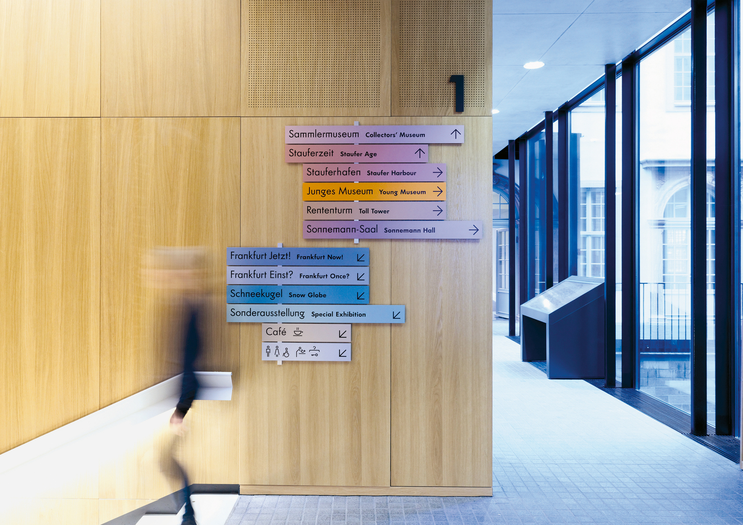 The five buildings of the Historical Museum and the Young Museum in Frankfurt, Germany, with their 800 years of architectural history presented a huge challenge for the conception of a new signage system. As part of a redevelopment of the Futura “Frankfurt Font” as the corporate font, new icons and arrows have been designed. In addition, a modular system has been created that includes three sizes of aluminium signs featuring prints of meticulously matched metallic colours. The signs themselves are shifted within the grid system, resembling urban signage.