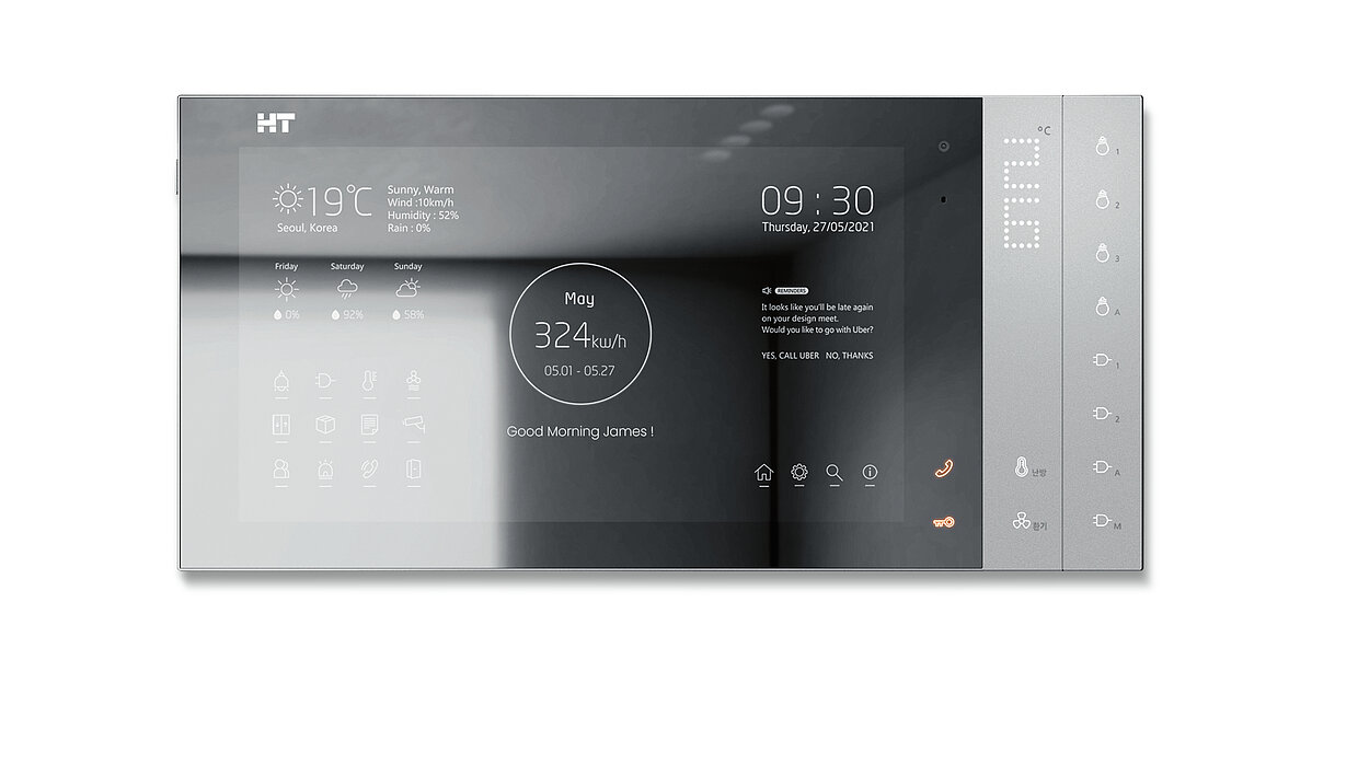 The HNF-I7130 modular wall pad separates and combines integrated control units, enhancing the user experience for smart home services. In addition to controlling various IoT home devices such as heating, lighting and ventilation, it offers a thermal imaging camera and a face recognition function in combination with the HLF-I3100 lobby phone for public areas, providing for phone-based temperature control and improved security in the residential environment. The devices can be operated with simple voice commands and form a distinctive functional unit due to their straight lines and clear design.