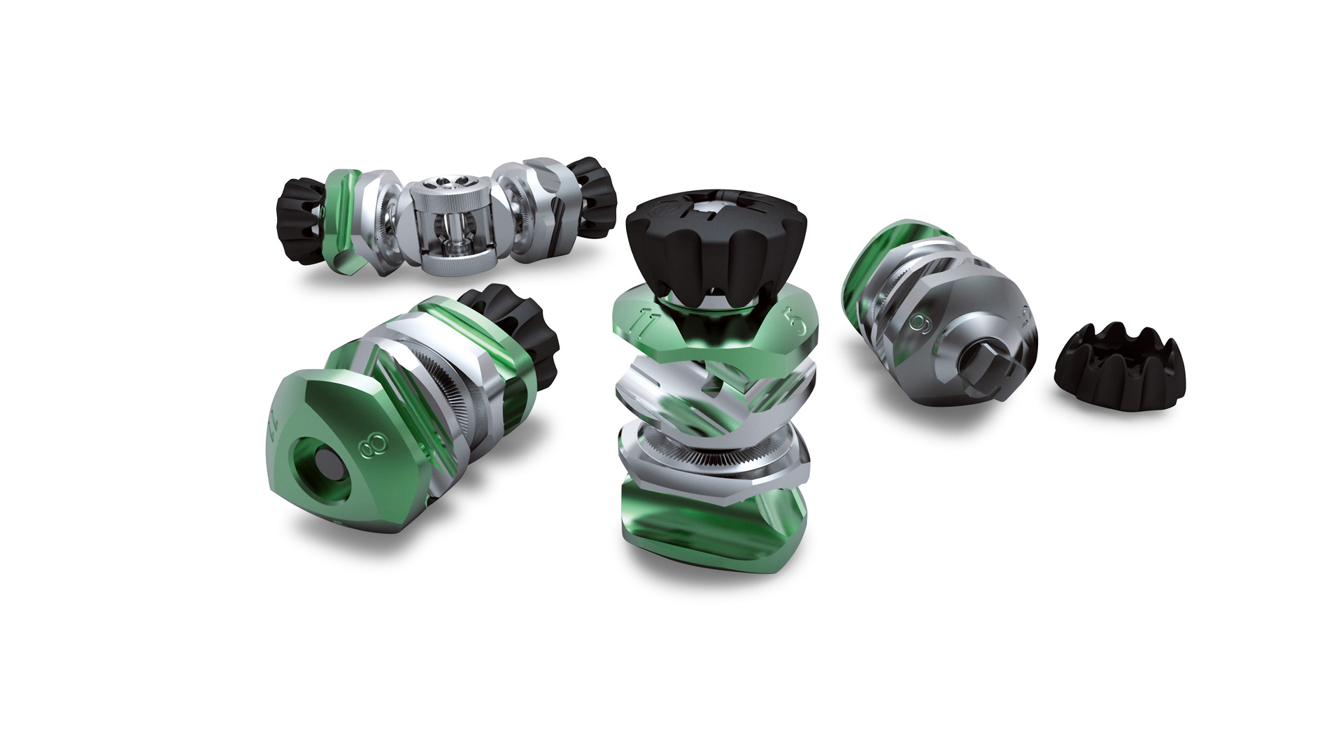 This external fixator for the primary care of bone fractures combines three different connector diameters in one coupling. Quick fixation of the components using the disposable thumbwheel supports fracture reduction and indicates that the final tightening of the coupling is yet to be carried out. The convex connecting elements converge to a triangular shape, and the green colour scheme has a calming effect.