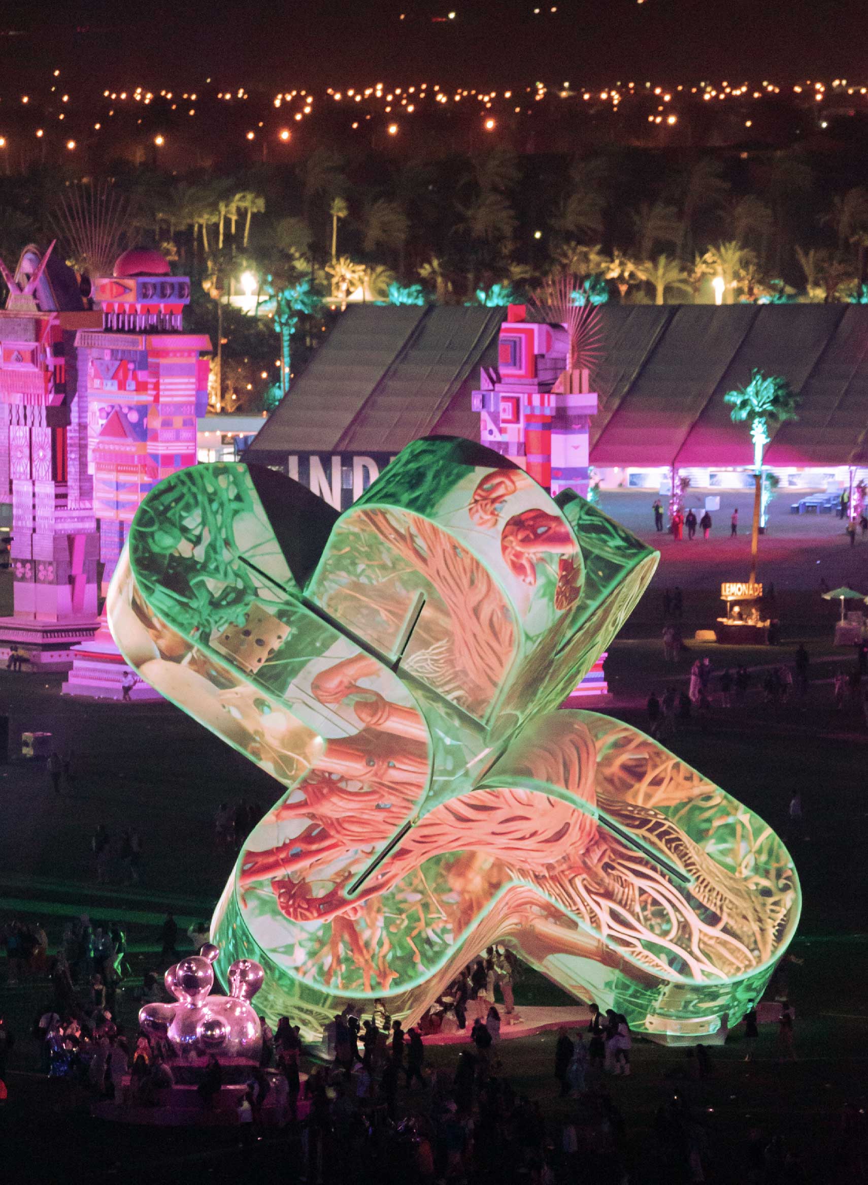 Holoflux is an 18-metre-tall installation designed by Güvenç Özel that debuted at Coachella 2023. It transforms with shimmering surfaces and real-time projections, engaging the public at the intersection of physical and virtual worlds. Using innovative materials and AI, it features diachromatic surfaces, 360 cameras, and 16K generative content, responding dynamically to the festival’s environment, creating a reflective, crystallised, or transparent appearance.