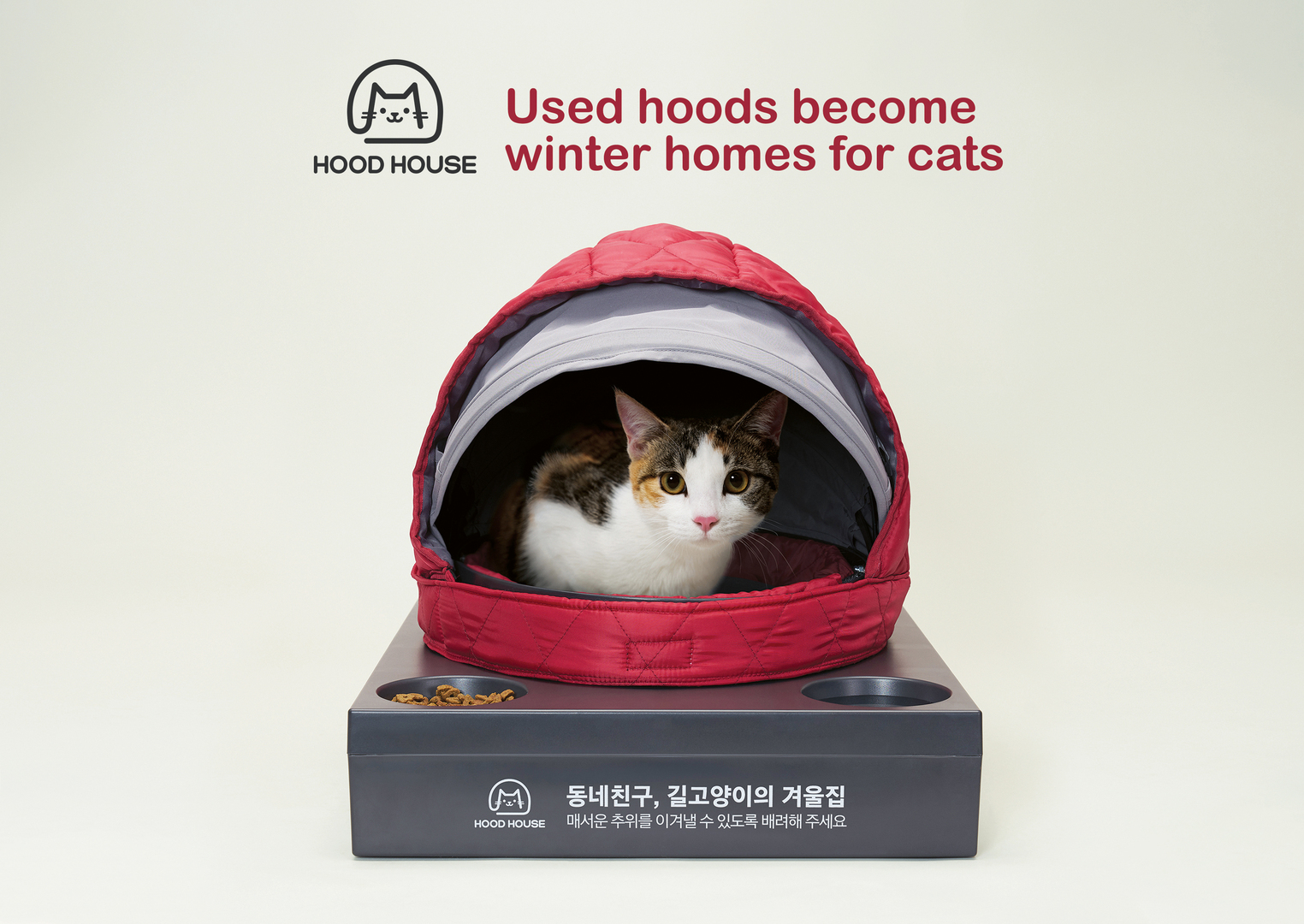 Over the last decade, the number of stray cats has increased in South Korea but there is very little public support for helping these animals. In collaboration with the national pet shop chain Molly’s Petshop, an eco-friendly solution provides over 2,000 cat shelters by collecting padded clothes and upcycling them into portable cat shelters. Inspired by the hooded shape of igloos, the design uses an easy-to-assemble dome shape. Each shelter includes bowls for food and water. An accompanying campaign lets people know that the shelters were given away for free at all Molly’s Petshop branches to customers who voluntarily bought food for stray cats during a two-week period in December 2017.