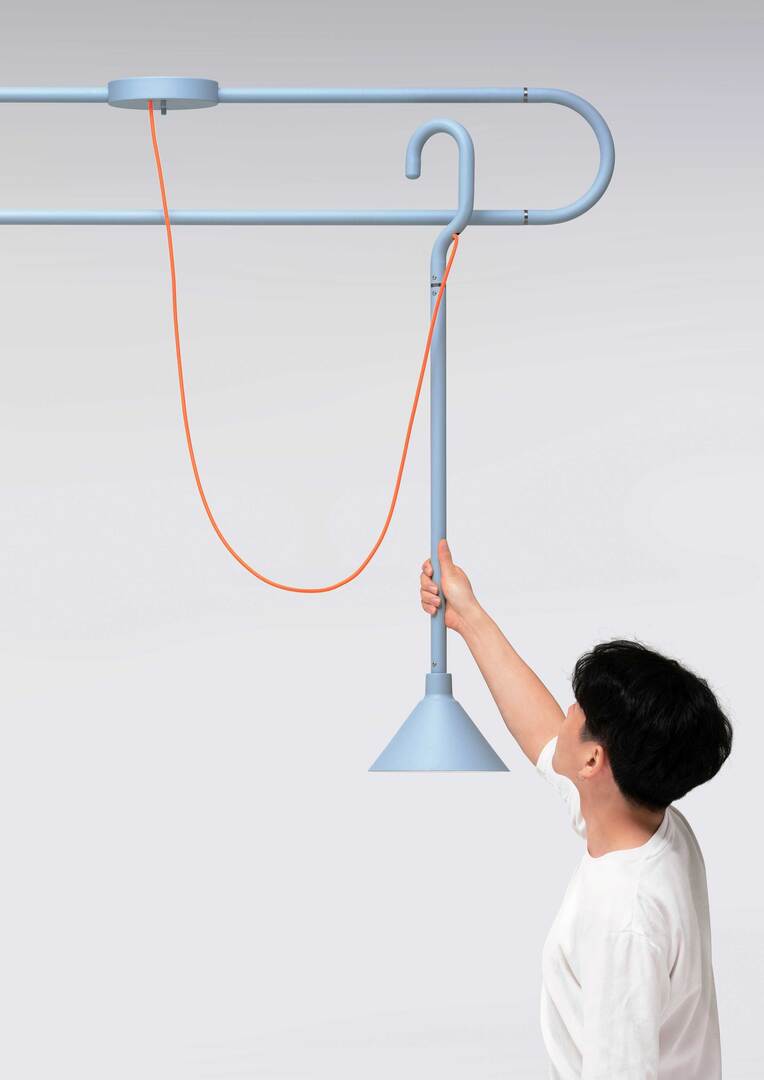 Inspired by how stall owners in the traditional Dongmyo flea market in Korea use hangers to display objects effortlessly, Hook is a new ceiling pendant lamp concept. It allows users to easily adjust the placement of the light according to the needs of the situation. The light's position can always be determined and readjusted to match the radius of the user's actions. Hook is constructed by bending steel pipes into ‘hook’ and ‘curved’ elements. The lamp shade is a simple steel conical form, and the pendant lamp can be customised to preferred heights by using longer or shorter sections. Red Dot Award: Design Concept | Concept | Illumination