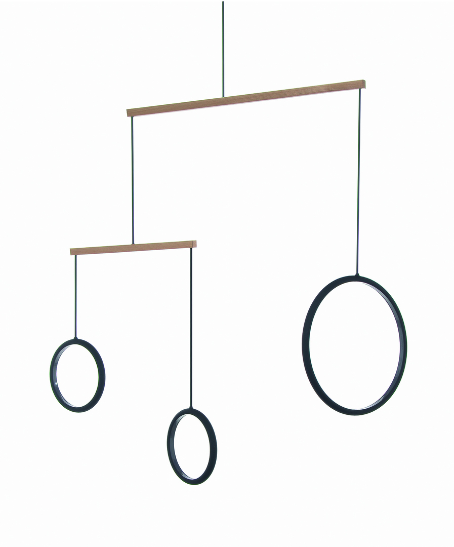 Hoop recognises the huge difference in the static quality of an electric bulb and the fluid quality of natural daylight. It is composed of modular frames and illuminated rings – two differently sized three-dimensional printed hoop illuminations, and three wooden frames of different lengths. This simple system lends itself to multiple variations of combination to suit any interior situation. Hoop moves according to the air movement in a room, be it from natural ventilation, air conditioning or someone walking past. This state of animation is a sympathetic metaphor for constantly changing natural light.