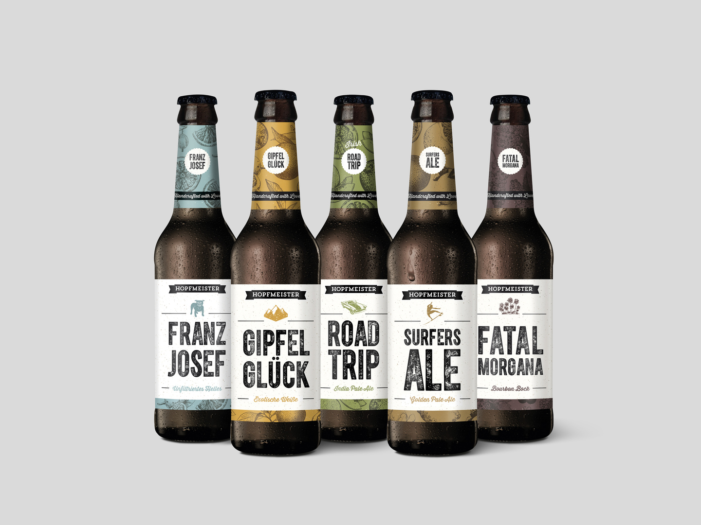 Hopfmeister beers are a mix of Bavarian heritage and a humorous approach to design and storytelling. Ingredients and craftsmanship are taken seriously, whereas the Hopfmeister brand and its concept created by a group of designers are amusing. The label design comprises a series of different versions, which, according to each individual beer type, illustrate a unique taste experience and show a mix of vintage and modern elements with patterns made of steel engravings, and a typography combining letterpress and classic styles. The names of the beers, in particular, create an appealing quality, while the colour coding along with matching illustrations tells funny stories.