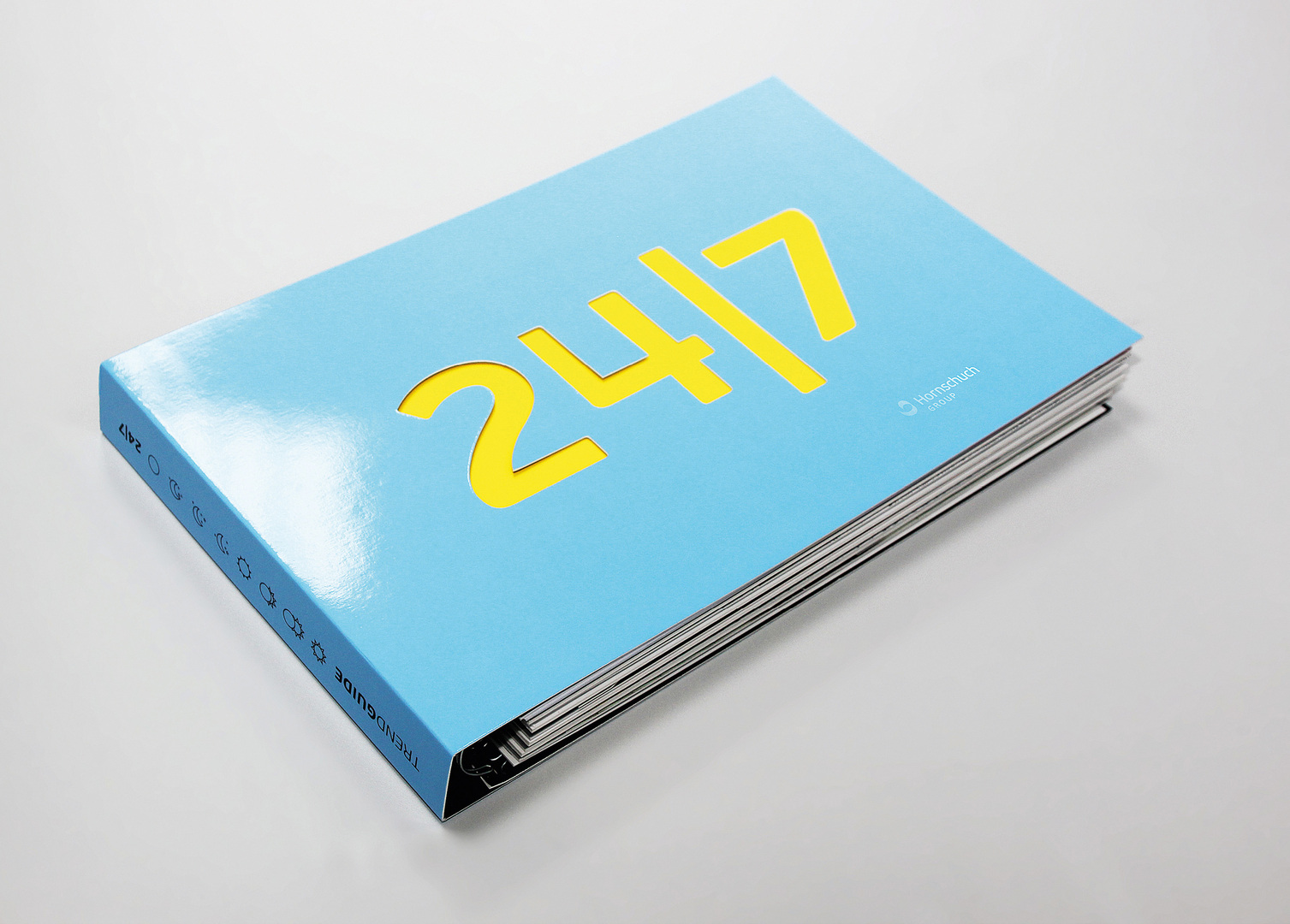 As the continuation of the company’s design guide, the “Hornschuch Trend Guide 24/7” is a tool and common thread for the in-house design team and customers alike. The trend research in the first part takes the reader on a journey through current design worlds. Micro mood boards make the design development process transparent. In the second, interactive “24/7” part, the company demonstrates its variety of products. The light-blue cover represents day, the black inside night. In this section, customers can play with the innovations, try them out with different colour chips and develop ideas for combinations with their own products.