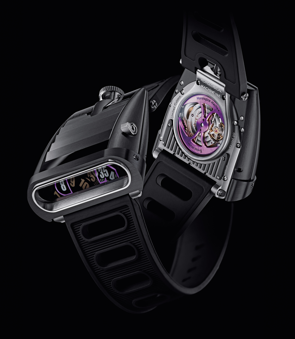 The time display of this watch consists of two dials that rotate in opposite directions with jumping hours and comes equipped with a prism that has an integrated magnifier to improve legibility. This futuristic model also has an in-built mechanical automatic movement protected by a waterproof inner case. To improve its resistance to scratches, the watch is made of a dense polycarbonate resin reinforced by carbon nanotubes.