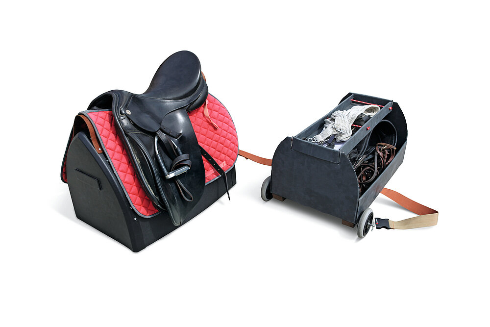 How can grooming materials for horses and saddles be transported more conveniently than ever before? The answer is a uniquely shaped trolley, which is perfectly suited to store everything one needs to go horseback riding, but still compact and light enough to be transported in any car. Thanks to the shape of the cover, the saddle can be strapped on top of the trolley, which leaves enough space inside the trolley to carry the rest of the equipment.