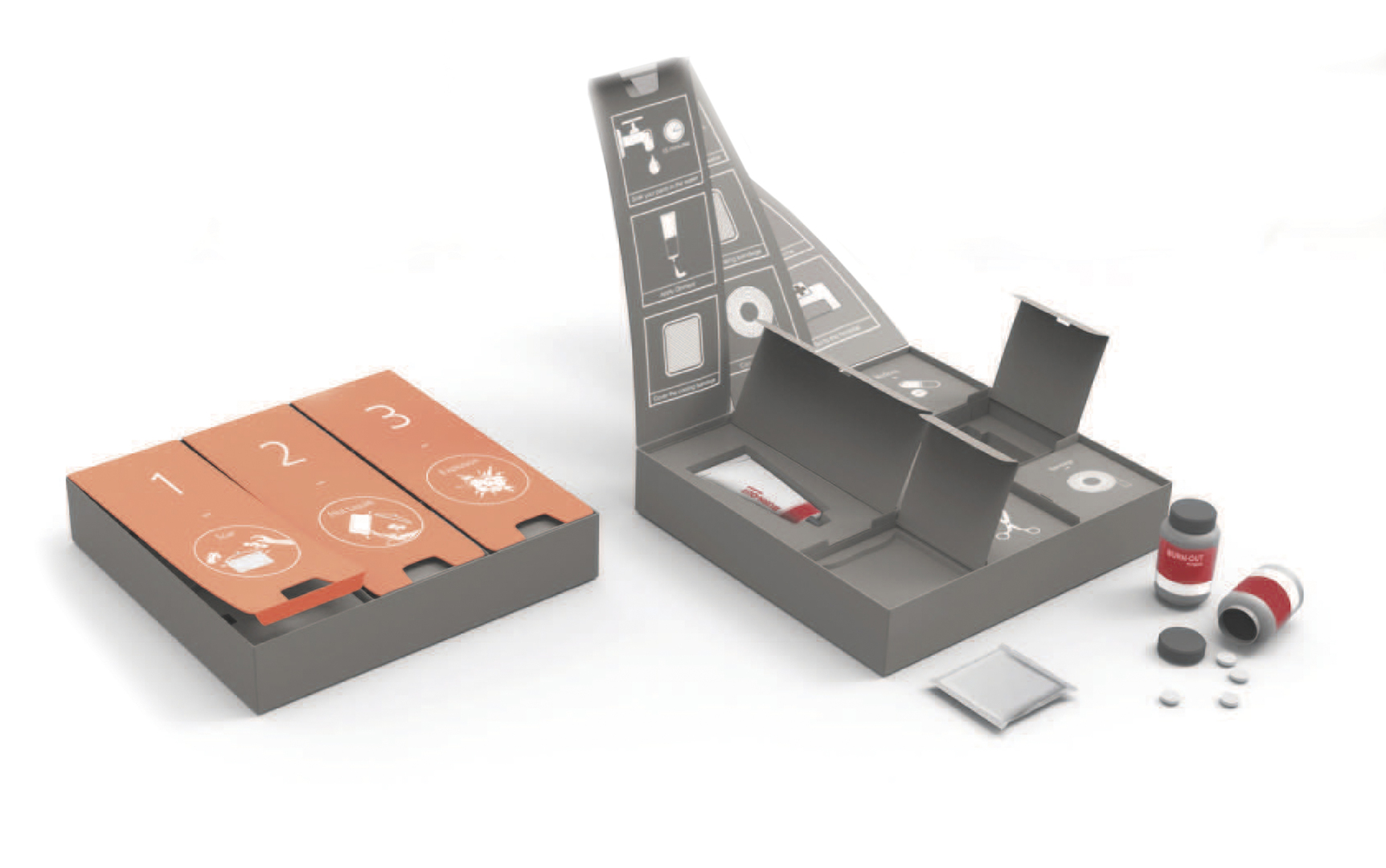 According to the World Health Organisation, the mortality rate for children in Africa is triple that of other countries and a significant number of these deaths are caused by burns. Hot Care is a burn emergency kit that uses graphics and clever packaging design to make post-burn treatment protocols intuitive to follow. The treatment kit is divided into 3 compartments, each containing specific and necessary first-aid items for 3 different types of burn. Graphics on the cover of each compartment help the user identify the type of burn injury so that they can pick the right treatment products for immediate treatment.