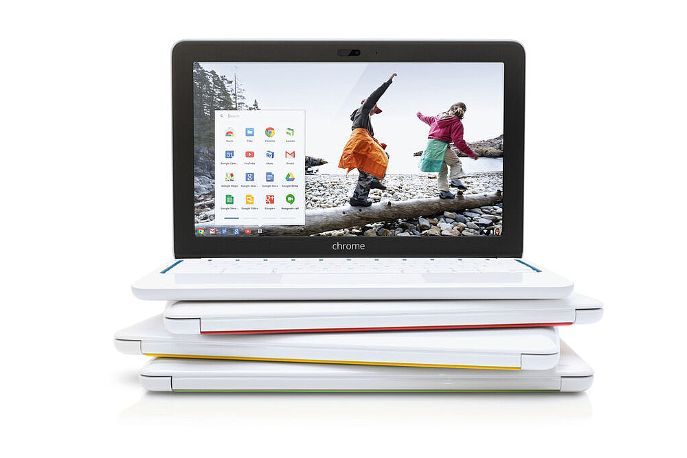 The Chromebook 11 is designed to convey elegance and simplicity. It weighs merely 1 kg, has a battery run time of six hours and can thus be easily taken along anywhere. There are no sharp edges pressing against the wrists while typing, and the device does without cooling fans, thus allowing the laptop to run quietly during operation. The screws and speakers are concealed in the magnesium housing so that the device displays a seamless design.
