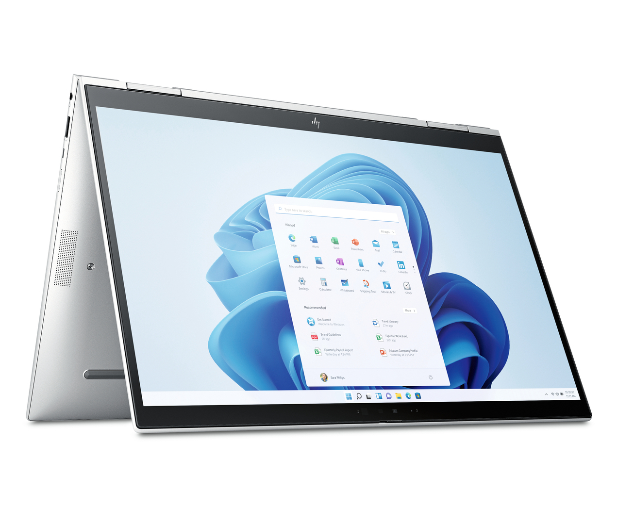 The development of the HP EliteBook 1040 / x360 Aero G9 was focused on the ecological aspect. Thanks to sustainable manufacturing methods, the screen cover, keycaps and palm rest are made mainly of recycled materials. The CNC-milled magnesium housing of the 14" laptop, which weighs just under 1.5 kg, looks extremely slim and elegant thanks to its rounded edges. This high-quality impression is also supported by the trackpad, which is framed by a diamond-cut and polished ring.