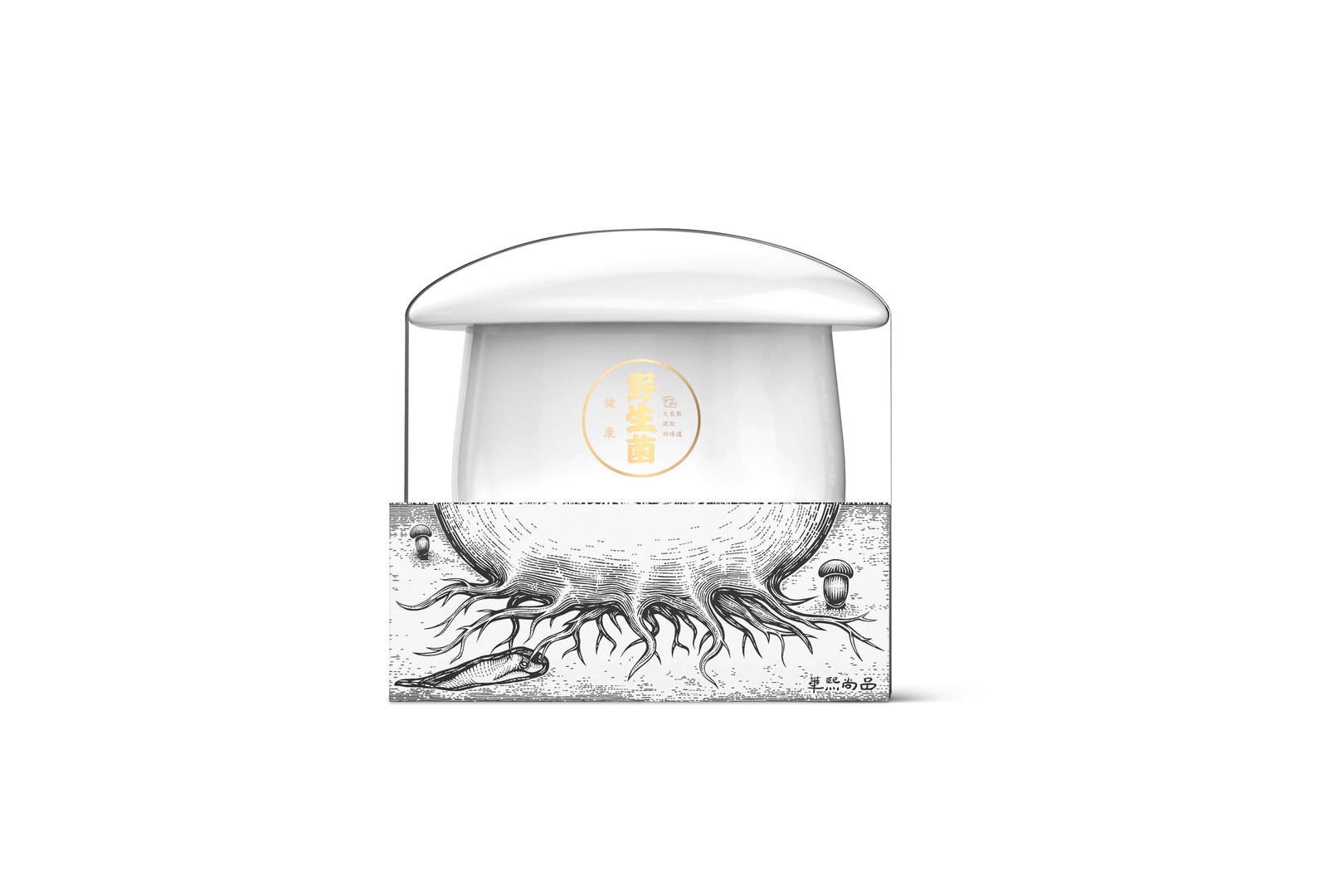 The design of this packaging for wild mushrooms is inspired by nature, as the container and its protruding lid imitate the shape of a mushroom. It is designed in a classy white colour with a gold logo which accentuates the product’s premium appearance. The bottom half of the container is packaged in a cardboard box featuring black-and-white illustrations. Roots drawn on the sides of the box create the impression that the container is growing out of the earth. A blue banderole is used to tie this high-impact packaging which is sure to attract the glances of consumers.