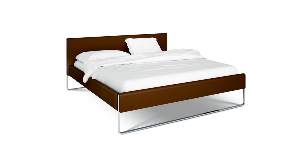 A purist design in combination with elegant detailing characterises the NEO bed. As the outer dimensions are only 13 cm wider and longer than the inner ones, it takes up minimal space. Its svelte supports, either in high-gloss chrome or anthracite-coloured textured paint, give the bed a light almost floating appearance. It is between 53 and 56.5 cm high which makes it easy to get in and out. NEO comes as both as an upholstered bed in a range of different leathers and colours and in a painted or wood version.