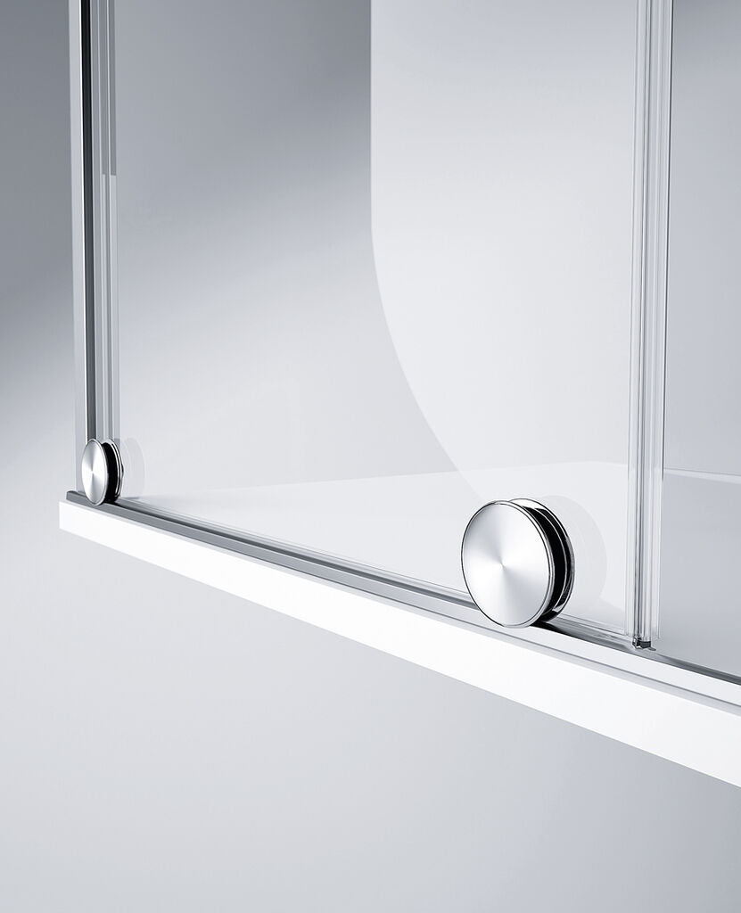 A highly transparent real glass sliding door design for a shower enclosure with floor-level comfort walk-in provides more safety than a swinging construction. It also saves useful space. The highly transparent glass door disappears almost completely behind the fixed segment. The construction dispenses with the upper guide rail, which enhances the high-quality overall appearance and still ensures overall splash protection. The puristic door handle is mounted on the very edge of the glass surface. Thus, the door can be opened and closed easily both from inside and outside. The optional anti-plaque glass treatment allows easy cleaning.