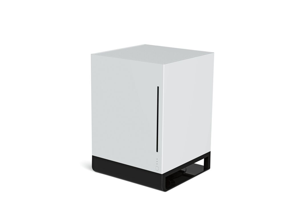 Hugo is a mist-free humidifier with a reduced design that works on the basis of evaporation. Water is poured into the top of the unit and absorbed by an antibacterial filter. The water is first purified, filtering out 99.99 per cent of bacteria, before it evaporates. The water vapour is passed through a fine sieve so that humidification of the air takes place without a visible mist. To clean the unit, the bottom cover is simply unscrewed.