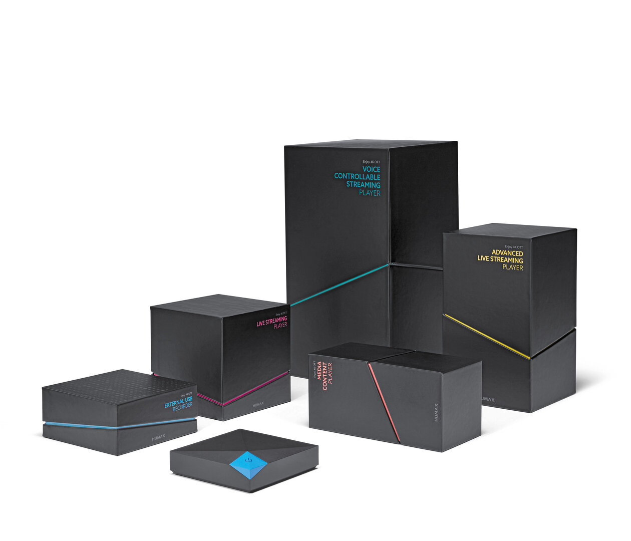 Humax 4K OTT is a premium product range of streaming devices that allow the user to enjoy diverse online media content. The packaging emphasises the edged design line and key colour of the product, while reflecting the distinctive look of the product range. The black shade combined with the rectangular shape expresses high-tech product qualities. Also, the variety of vivid hues helps to convey the main feature of the product in a clear manner. The geometric pattern as a trendy design element is illustrated on the top of the packaging. When opened, an asymmetrical line with bright colours arouses interest.