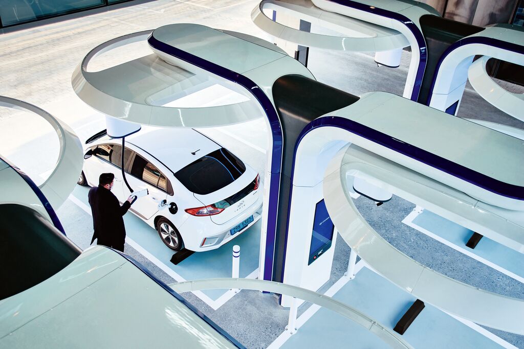The concept of the charging station for electric cars in Gangdong, South Korea aims to turn the charging process into an experience. By combining a rough concrete surface with a futuristic vocabulary of form, the design creates a space with a dynamic atmosphere. The ceiling opening in the centre of the station also gives users the opportunity to keep an eye on their car while visiting the cafe inside the building.