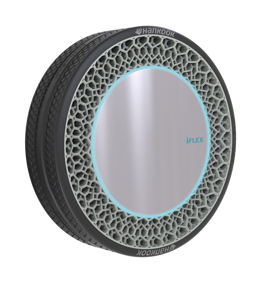 The i-Flex is a futuristic non-pneumatic tyre concept with a diameter of 400mm and a width of 105mm, designed in the form of biometrics. Unlike conventional tyres, it provides greater safety in the event of a tyre puncture-related accident. It is also ideal for autonomous driving mobility because it does not require air pressure maintenance.