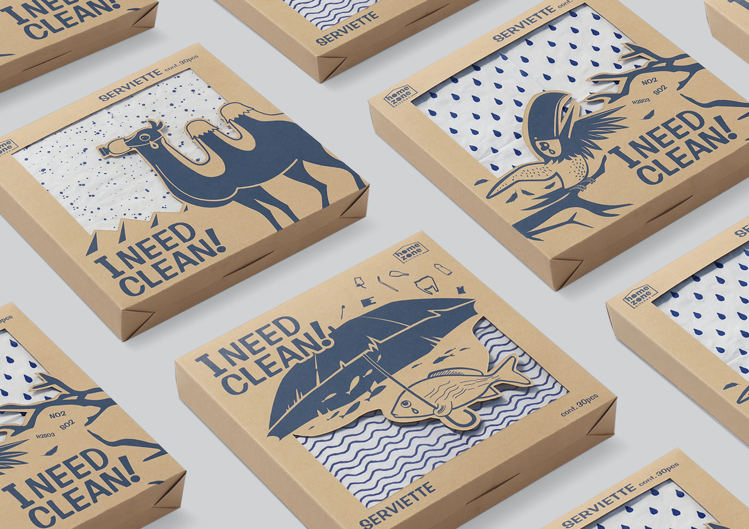The design of “I need clean!” challenges the viewer to take a second look at its message. At first glance, it shows birds cheering in the rain, fish leisurely playing on the seabed and camels strolling in the desert. However, a closer glance reveals plants destroyed by acid rain, birds without all of their beautiful feathers and a fish holding an umbrella to prevent pollution from harming its children. With the call “I need clean!”, the animals on the packaging also feature on the napkins inside, reminding everyone that it is high time to preserve our ecology together.