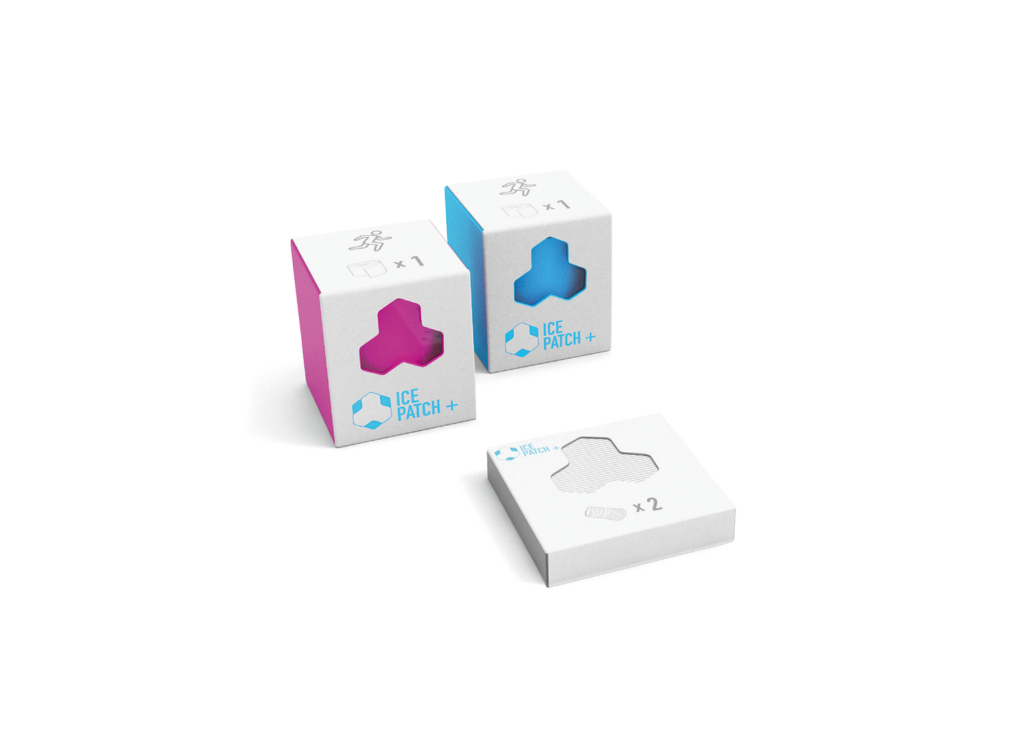 ICE PATCH + is a cooling product designed to be attached on elastic tape to avoid direct skin contact. Thermochromic microcapsules inside the pad demonstrate the change of temperature by change of colour. The package containing the pads resembles a clinical thermometer, emphasising the medical purpose of the product. It can be hung in the refrigerator using a loop to save space. The tape comes in boxes which allow the customer to have a look inside through crystal-shaped cut-outs. With this, and with a concise logo, the packaging creates a link to the special shape of the cooling pads.