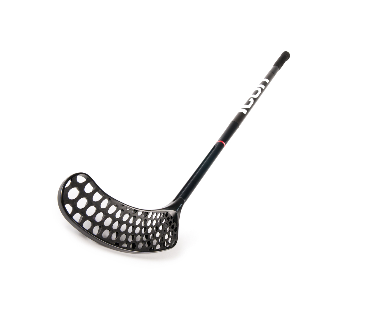 The Icon floorball hockey stick differentiates two grip zones that have been individually optimised for specific ergonomic demands. Thanks to the rotationally non-symmetrical cross section of the front end of the shaft, the stick demonstrates enhanced rigidity in the direction of the strike as compared to a transverse position. This increases forward loading in a correctly executed strike, resulting in higher ball velocity. The bone structure on the front surface of the blade allows for highly precise ball handling.