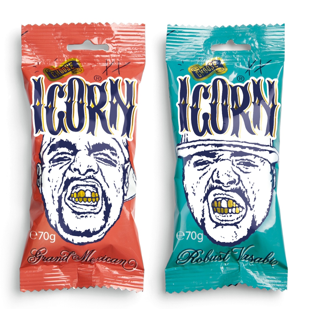 iCorn is a new brand of salty corn snacks. Instead of showing the product, which is new to the Russian market, as large as possible on the packaging, the packaging design chooses an unconventional visual language. Since the iCorn Snacks bear a resemblance to golden teeth, which can also be seen as a way of self-expression, the design features a provocative series of motifs: Inspired by Lady Gaga, Johnny Depp and Rihanna, the comic-style illustrations of faces on the iCorn packages proudly show off their dental grills.