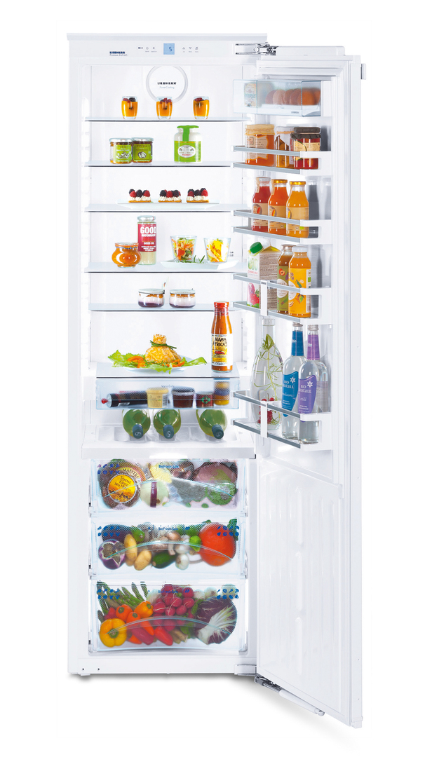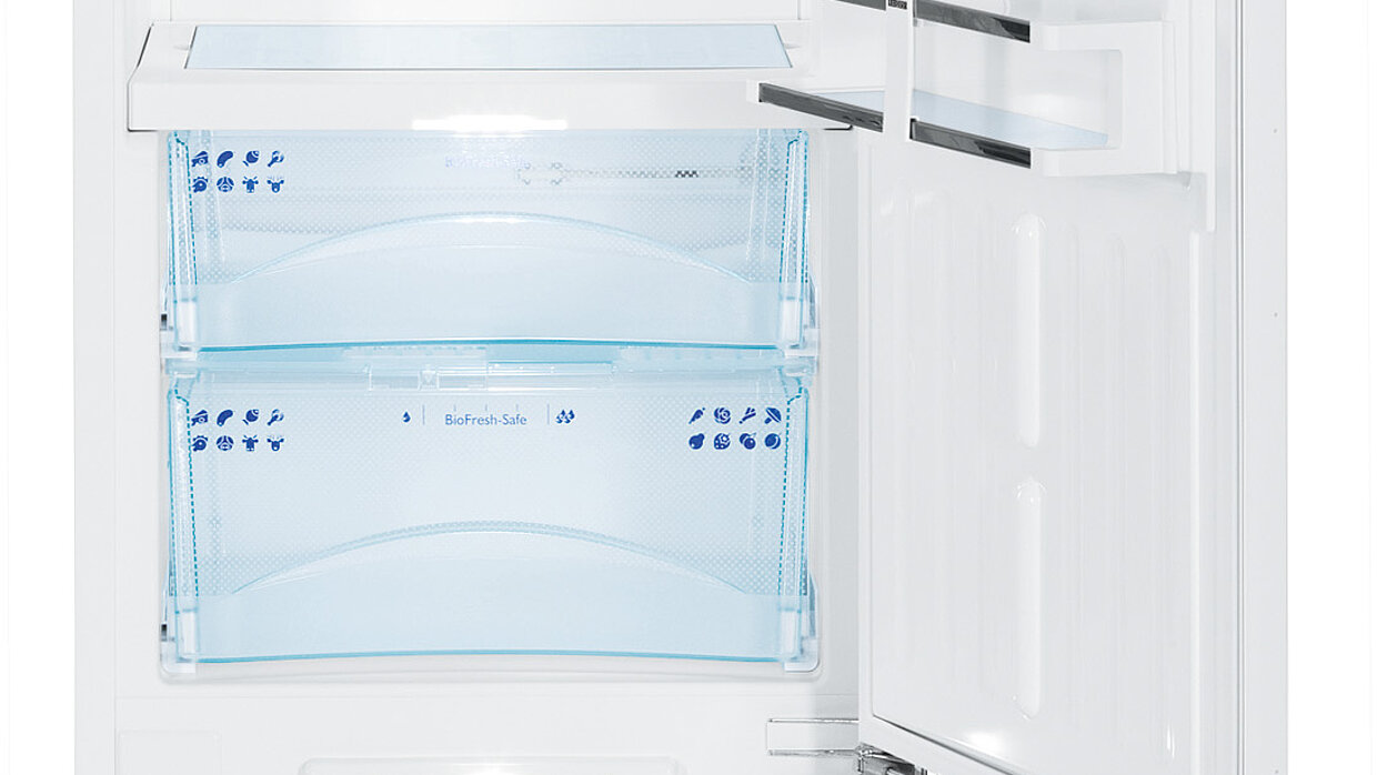 When this refrigerator was designed, special attention was given to the combination of energy efficiency and convenience of operation. When the door is opened, the LED columns integrated in the side walls provide pleasant light which gradually becomes brighter. The BioFresh compartments are illuminated, fully extendable and fitted with self-retraction and a soft-stop closing mechanism. Stainless steel profiles of the shelves and inserts as well as the GlassLine interior door highlight its elegant appearance.