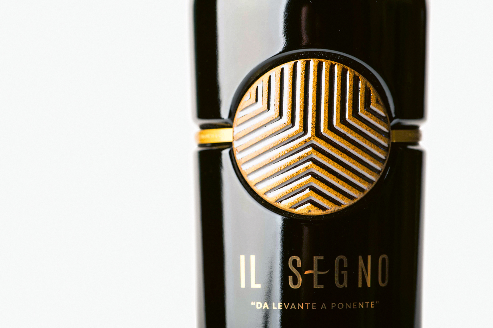 The design of this bottle combines the Italian traditions of wine-making and ceramics. The idea is to leave behind a “mark” – “Il Segno” in Italian. The label is made from an ultra-thin ceramic material adapted to the shape of the bottle and produced entirely by hand with platinum and gold decoration. It is attached to the bottle with great precision and supplemented by a gilded banderole displaying the company name. The front of the bottle has the name and designation of the wine imprinted in gold using screen printing. A paper tag explaining the idea behind the wine rounds off the design.