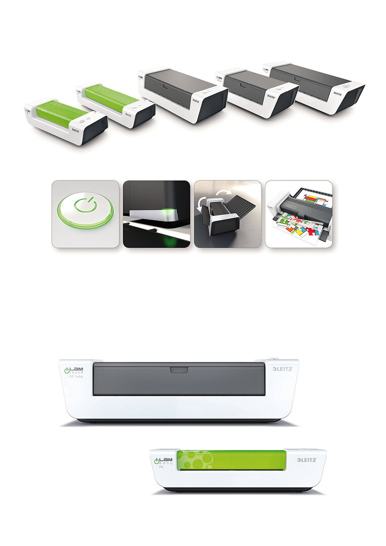 This newly developed laminator series from Leitz has been reduced in design and complexity. Setting the temperature, speed and pouch strength is no longer necessary; the devices are self-explanatory and operated by a single push of a button. The sensor technology detects the pouch strength and adjusts speed to temperature accordingly. Convenient in use, the patented flaps guarantee consistent laminating.