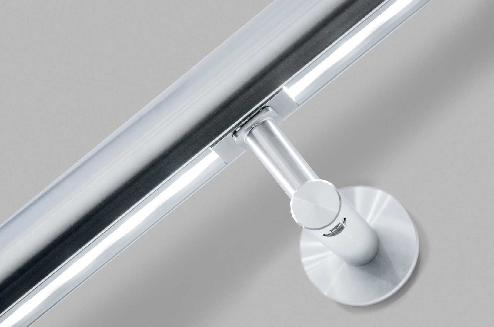 The special feature of this handrail and balustrade system is its LED illumination. The diameter and shape of the stainless-steel elements as well as the colour of the illumination may be chosen according to individual taste before the system is installed. It is suitable for use indoors or out. The wall brackets and baluster adapters can be moved into the desired position by sliding them along the profile and can be fixed without the need for additional welding, so that the flow of light remains uninterrupted.
