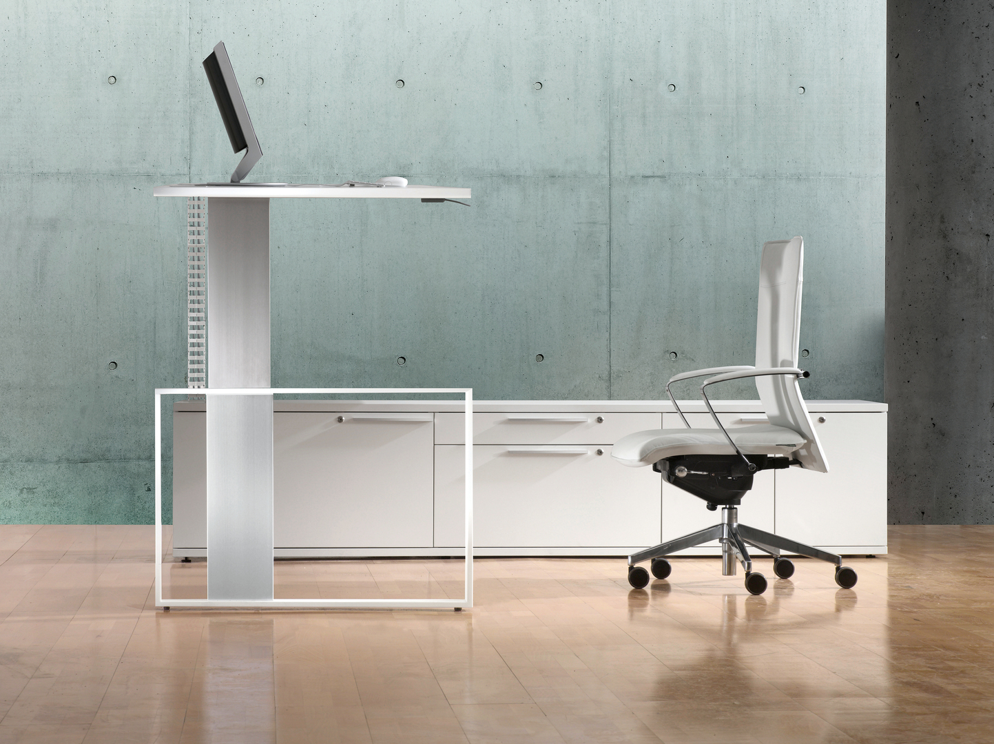 This height-adjustable desk system allows for quick shifts between sitting and standing: the work surface can be moved in a matter of seconds up to a comfortable height for a standing working position. The system is available in two basic versions: a C-foot desk frame with brushed aluminium column or a rectangular frame with optional chrome plating. Both variants can be connected to a functional and stylish lowboard, turning the unit into an intelligent solution for storing computers and cabling.