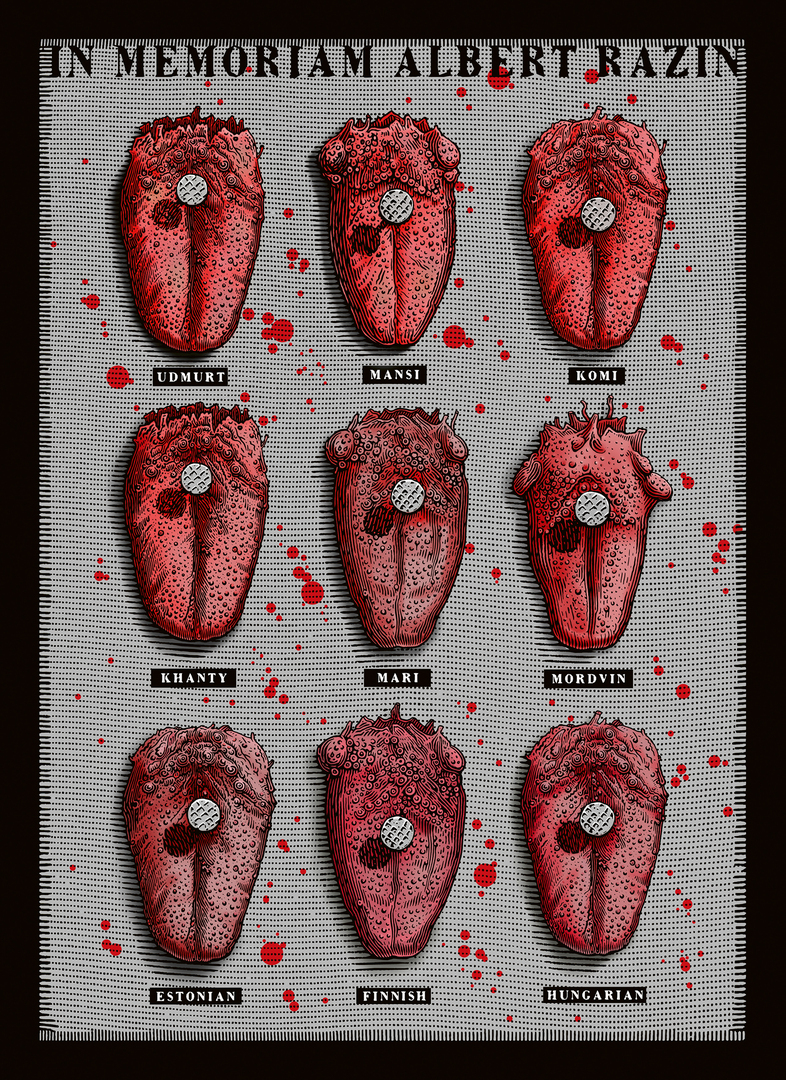 In 2019, philosopher Albert Razin set himself on fire in protest against the language policy of the Russian government and the oppression of Uralic languages such as Udmurt. The poster “In memoriam Albert Razin” commemorates this act and makes an unequivocal statement with its stark motif: illustrated tongues, torn out and nailed to a grey background, hanging above signs bearing the names of Uralic languages, blood splattered across the entire surface of the poster. This representation creates a powerful image of the conflict and calls uncompromisingly for this issue to be addressed.