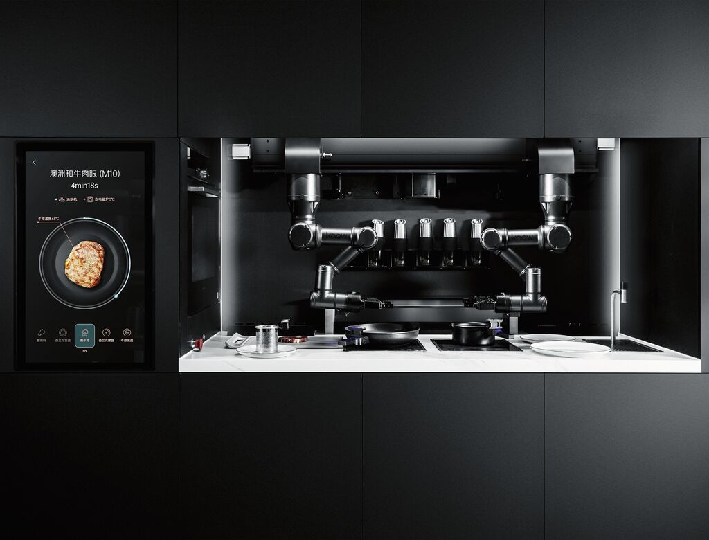 inChef is a kitchen system controlled by a specially developed program. It unites AI technology with a user-friendly interactive display in a unibody cabinet of traditional appeal, which also houses two robotic arms and kitchen appliances. The modular design of the arms allows for the use of various end effectors for different purposes. Through accurate identification of ingredients and kitchenware, as well as the combination of target-tracking and path-planning technologies, the inChef can imitate, memorise and reproduce the cooking skills of a chef or serve as an assistant.