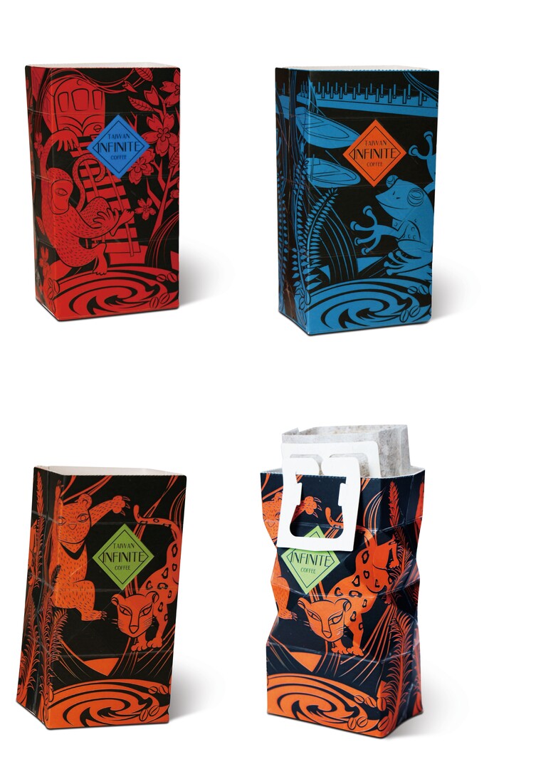 The brand name “Taiwan’s Infinite Coffee” represents the infinite vitality of the product with the concepts of reuse and regeneration of resources. The packaging design focuses on Mount Ali, Sun Moon Lake and Dawu Mountain, the three major places of coffee production in Taiwan. The illustrations highlight their special qualities: with the themes of totems, ecology and landscapes of aborigines; and through the style of paper-cut and local cultures, the features of Taiwan’s coffee are presented. The strong colouring emphasises its rich flavour.