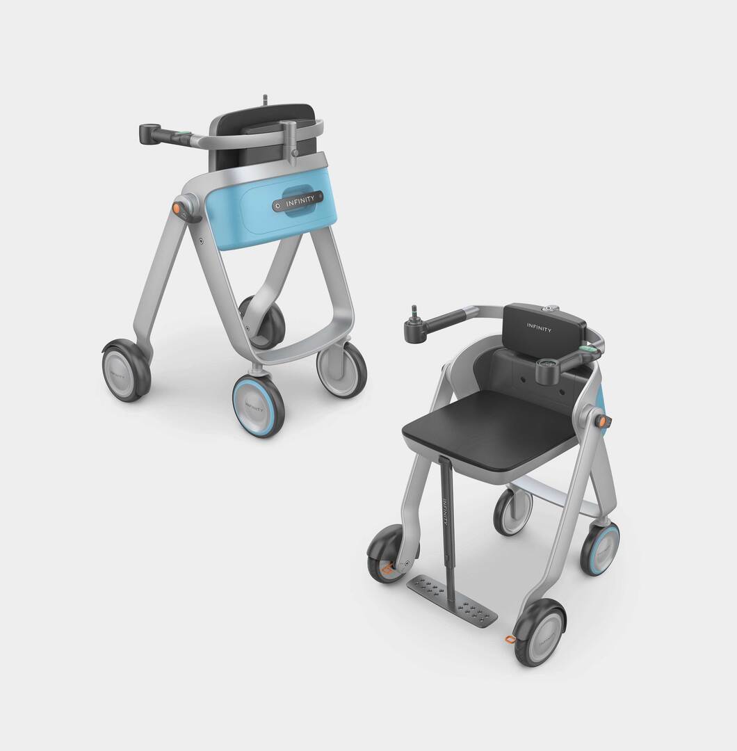 Infinity rollator (a wheeled walker) is designed to provide users with the choice to use the product as an electric walker or a motorised wheelchair. The idea for Infinity is to encourage the user to be active and walk as much as possible while supporting them when they need more aid. It is operated by a simple touch sensor on the right handgrip but also provides a ‘free-wheel’ lever that lets the user move the rollator manually.