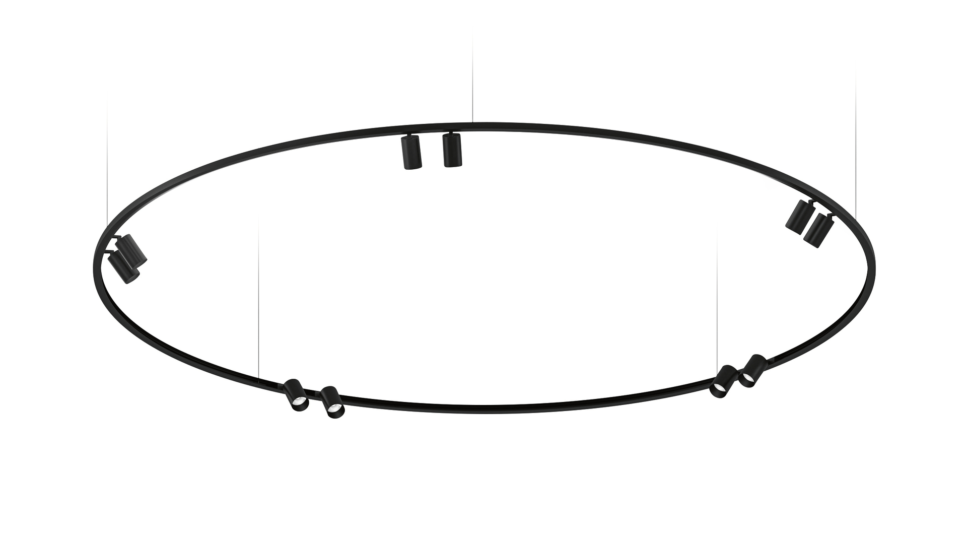 This suspended lighting system comprises power tracks that allow the installation of a variable number of different spotlights. INFINITY MODULE ROUND has been especially designed for the decorative illumination of representative rooms and can be installed individually or in combinations. The track ring is available in six sizes: from a minimal 1,500 mm to 4,000 mm diameter. Bigger rings can be custom-made upon request. The height-adjustable suspension system ensures easy installation in rooms of different heights.