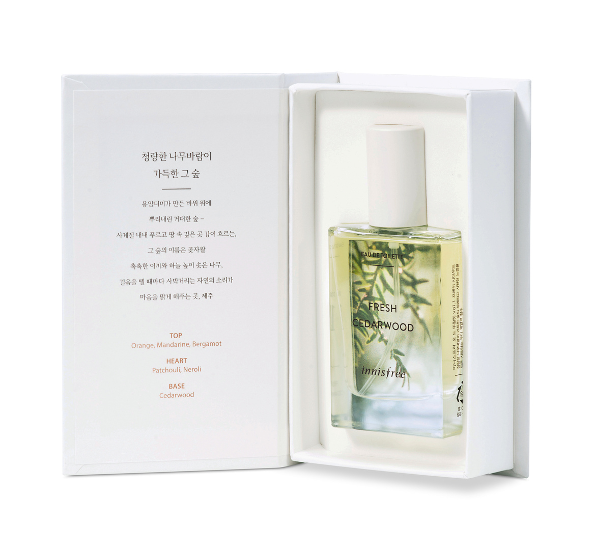 The Jeju Perfume Note is a perfume line consisting of five scents inspired by the flair of the Korean holiday island Jeju. Based on a travel diary, the packaging follows a clear design concept. When opened, the packaging is reminiscent of a book cover. The written record of scents on the inside of the packaging accentuates the high-quality impression. The transparent perfume bottle allows the decorative image behind it to shine through. After the product is taken out of its book-like cover, the cover can be reused for storing small items.
