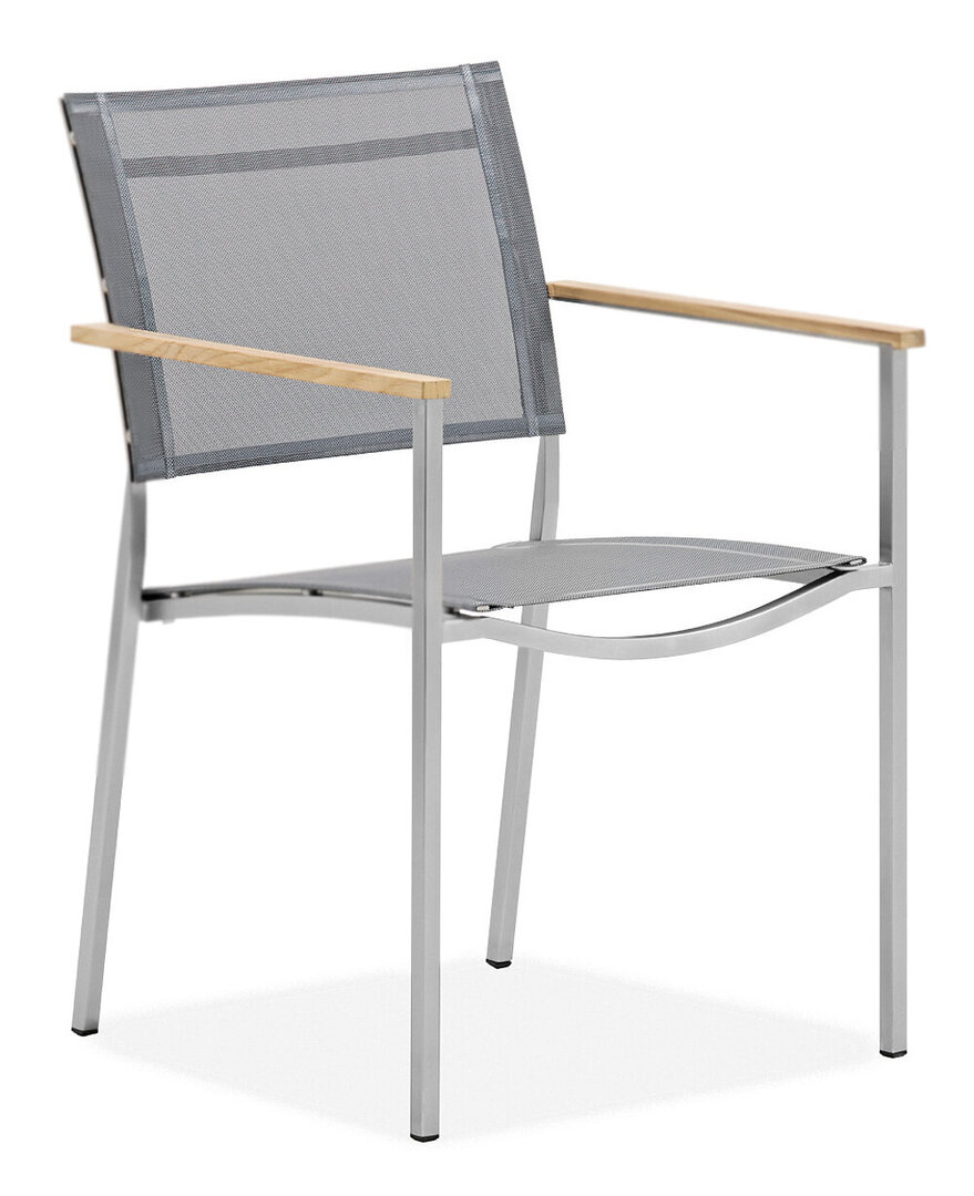 Linear and curved lines of stainless steel give the Inoxy chair a slender and modern appearance. Seat and backrest consist of synthetic textile, which offers enhanced seating comfort due to its air permeability. Eye-catchers are the teak armrests that provide a pleasant tactile experience, even at high temperatures. The chair is stackable and suited to both indoor and outdoor use.