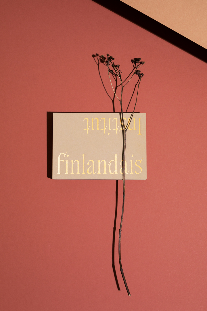 The Finnish Cultural Institute in Paris underwent a thorough renovation of the landmark Juhani Pallasmaa building. As part of this project, the visual identity experienced a renewal as well. Inspired by the structure and colours of the architecture, the identity aims to portray a side of Finland that is at once earthy and natural yet sophisticated and timeless. A custom typeface was created that is conceptually rooted in cultural exchange. The connective role of the institute was taken quite literally by making the letters reach out to each other like in a connected cursive script. The result is an identity and a stationery set that surprises with very tactile contrasts between the choice of materials, natural recycled paper, glossy brass foil and the delicate yet confident typeface.