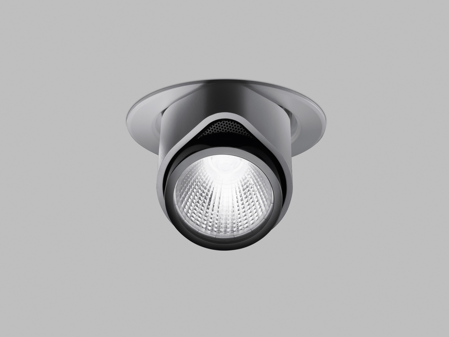 This semi-recessed LED luminaire combines the elegance of a built-in light with the flexibility of a surface-mounted spotlight. Its patented swivel-tilt mechanism allows for a 355 degree rotation and the tilting of the light by 35 degrees. A newly developed LED technology ensures that the light reaches the target surface in a controlled manner and produces soft, defined light cones. Intara ID offers even more flexibility by providing several power ratings, interchangeable optics and a variety of LED spectrums.