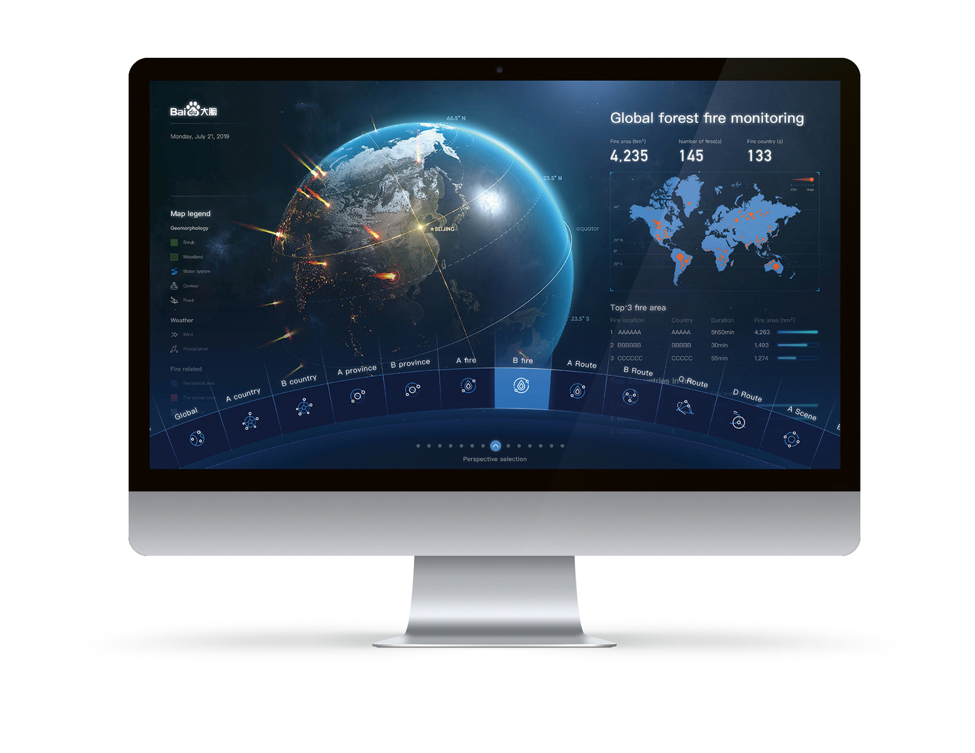 This user interface design uses AI technology to provide a full-process system for intelligent forest-fire monitoring. It can accurately detect forest fires globally while automatically triggering a warning system. Covering a wide range of detection scenarios, it meets the needs of institutions in different countries and regions. It detects overall fire parameters such as the fire status and the geographical environment. For instance, the system can intelligently deduce fire spread trends and automatically plan rescue routes.