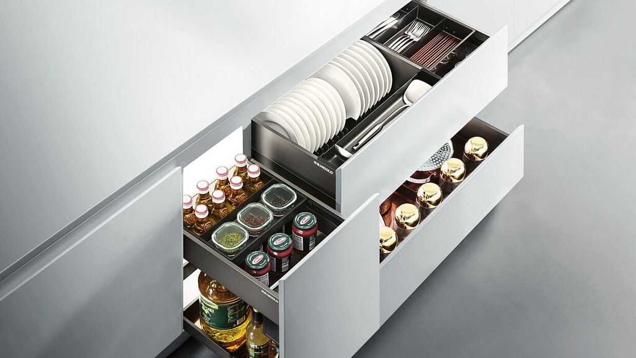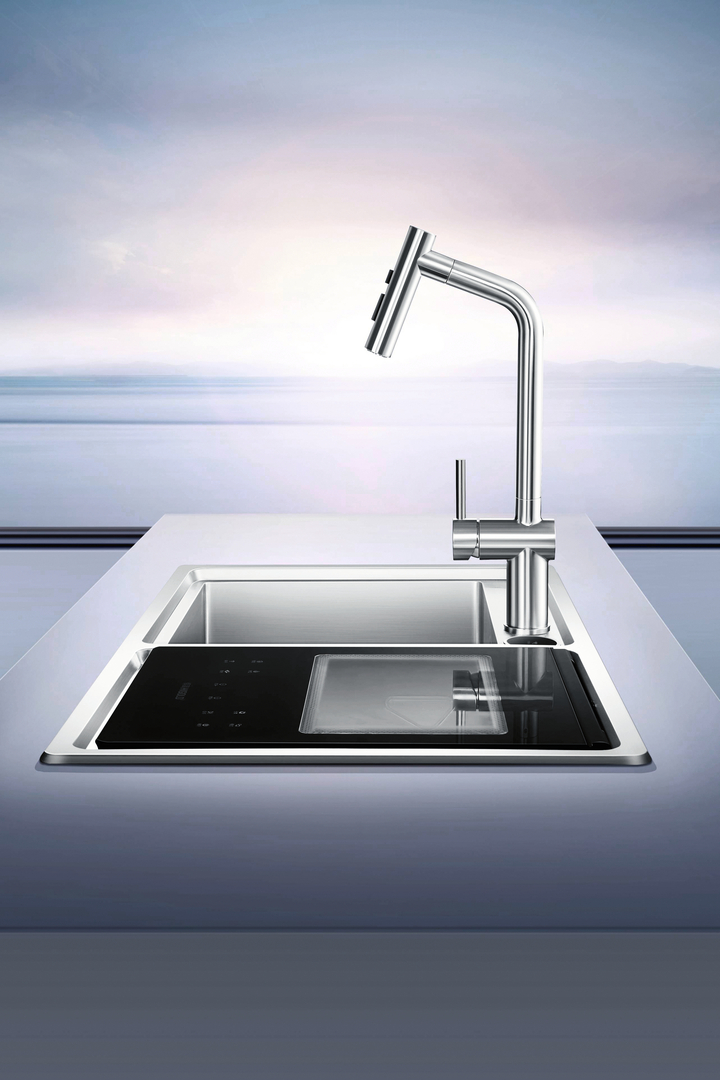 The Intelligent Steam Purification Sink is characterised by a reduced design language centred on its functionality: the easy and hygienic cleaning of dishes and fresh food. A handy steam cleaner in the sink area can be pulled out in order to effortlessly remove any residue from the dishes. Thanks to innovatively implemented technology, it is also possible to remove contaminants like pesticides from fruit, vegetables or seafood in the cleaning basin.
