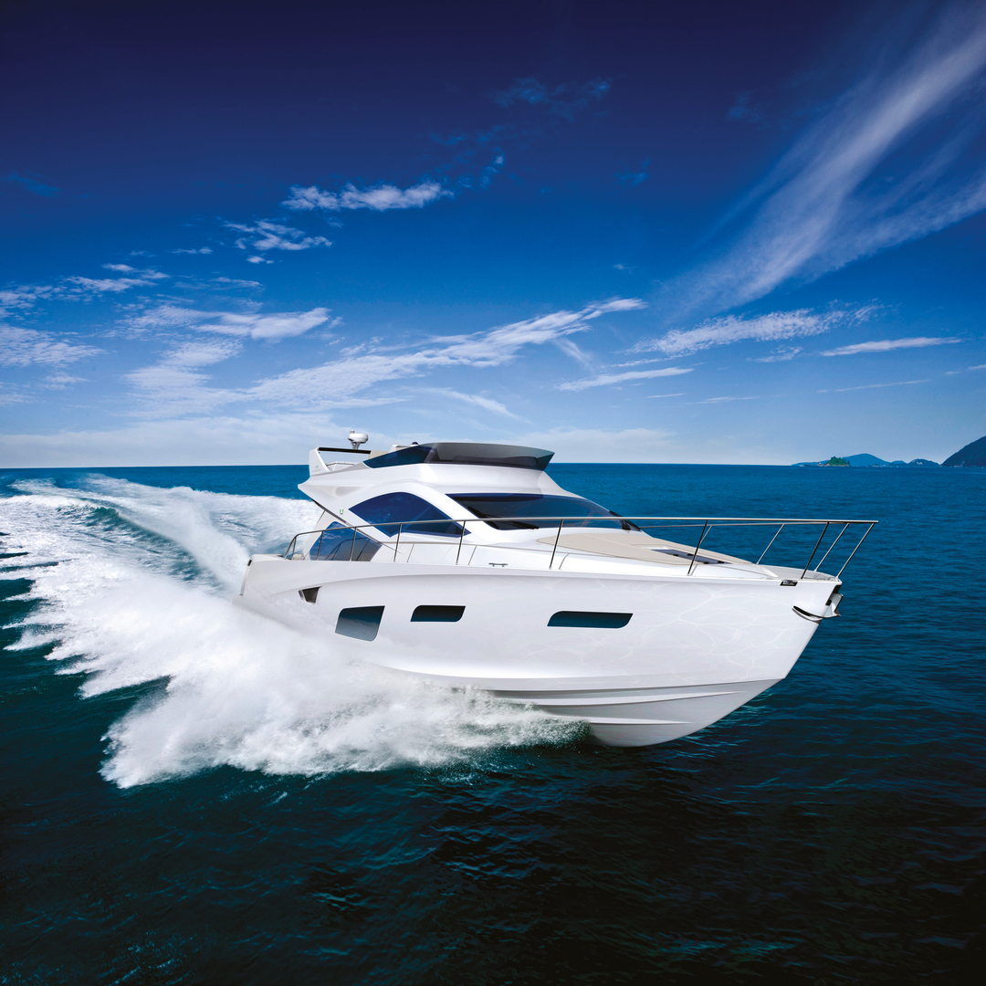 The exterior of the yacht offers an appealing impression with its elegant and clear line management. The trapezoid-shaped windows have a unique design and increase the brightness of the interior.