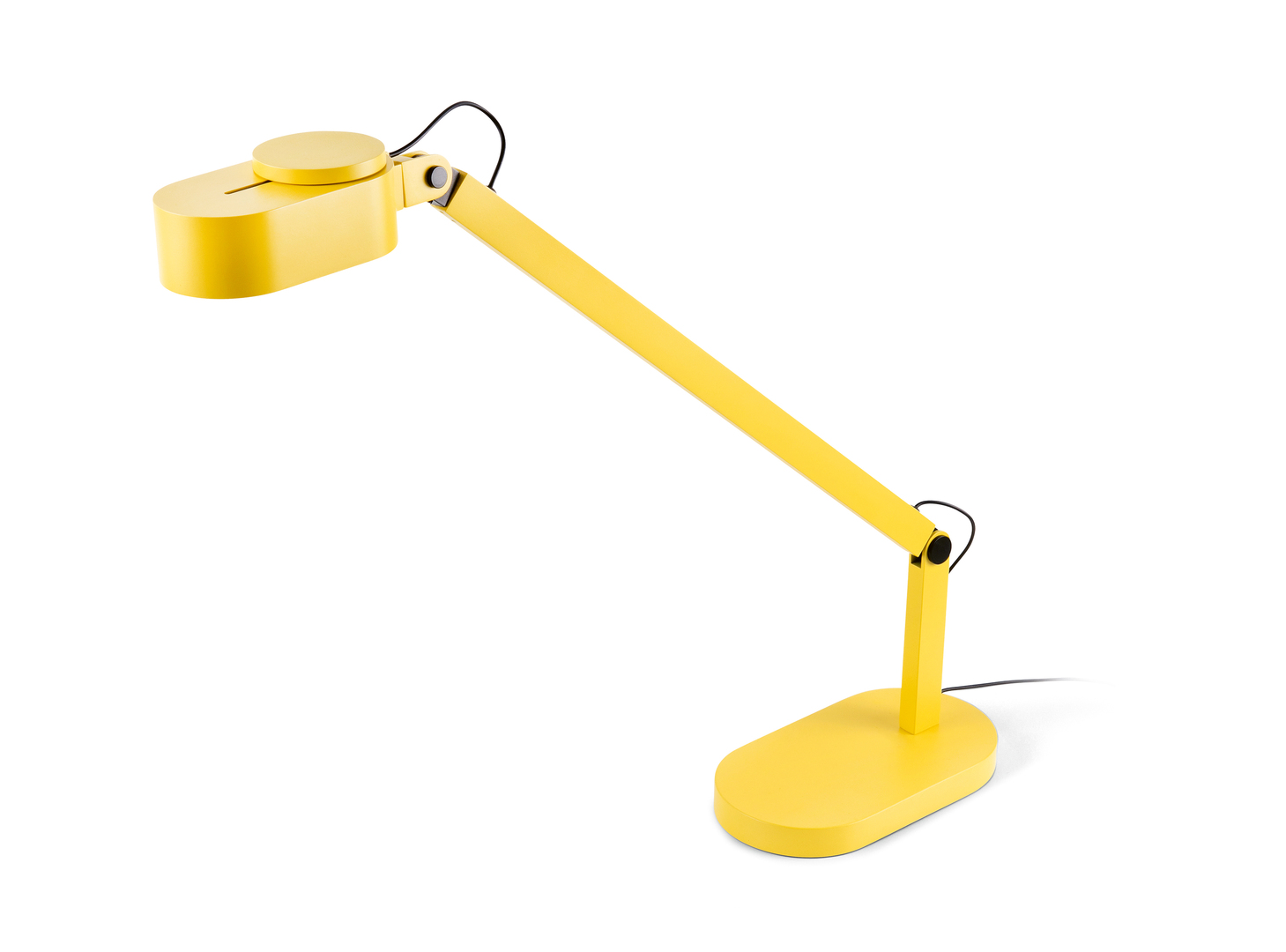 The INVITING desk lamp allows users to set the illumination as needed. The luminaire head can be adjusted both in its horizontal and vertical axis. The light can also be dimmed infinitely: sliding the round control element forwards or backwards alters the intensity, while rotating the control element changes the colour temperature. The desk lamp is available in different colour shades and allows for flexible positioning on a desk or bedside table by means of either a foot or clamping fixture.
